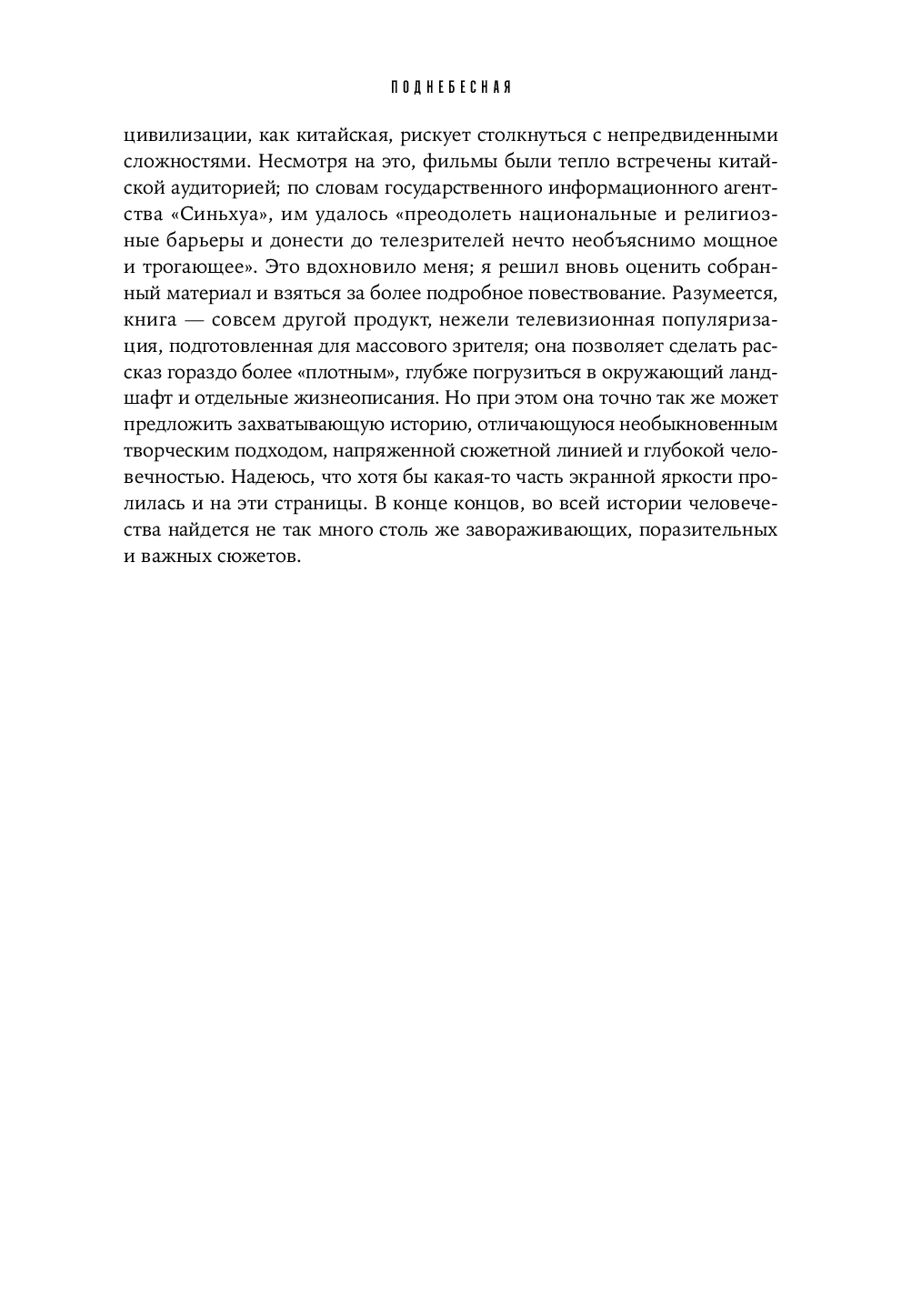 Автор описывает историю Китая с древних времен и до наших дней, опираясь не только на известные научные факты и последние археологические открытия, но также на дошедшие до нас письма, в том числе эпохи династий Цинь и Тан, на личные дневники, на свидетельства ныне живущих людей, рассказывающих о прошлом на основании семейных документов и устных преданий. Благодаря этому многовековая история Китая предстает как история людей – живая, драматичная и захватывающая.