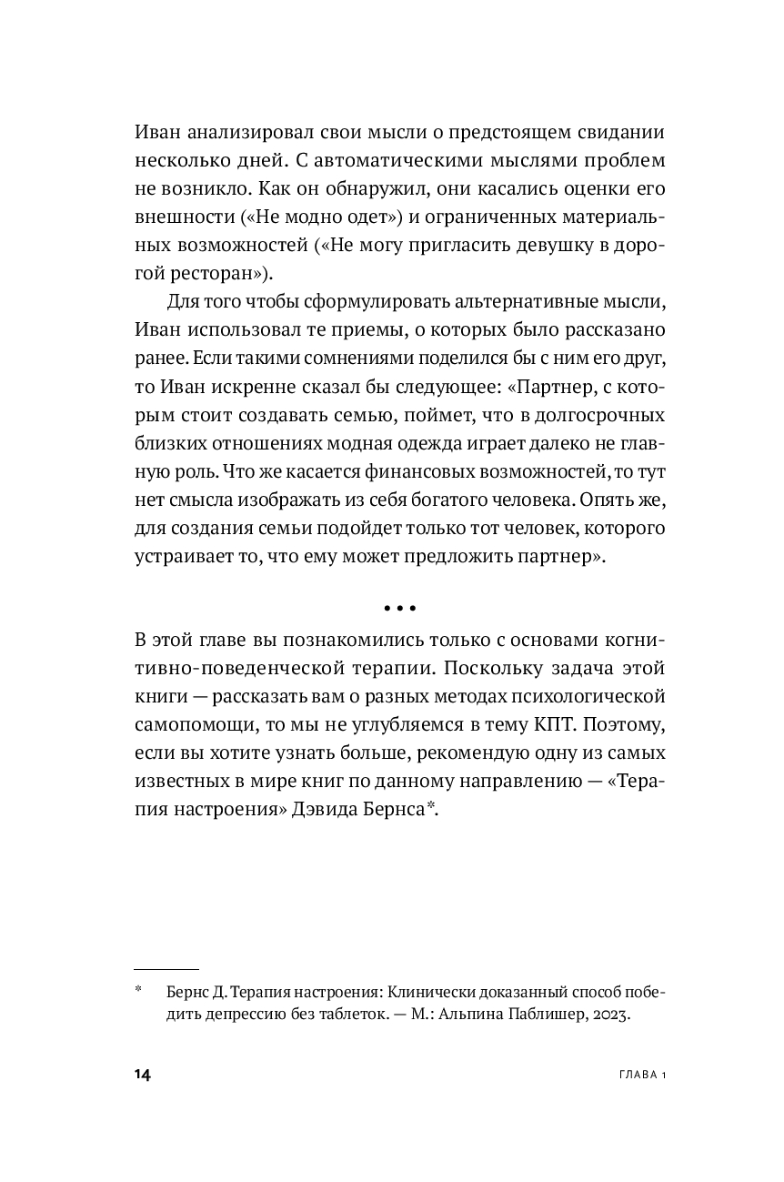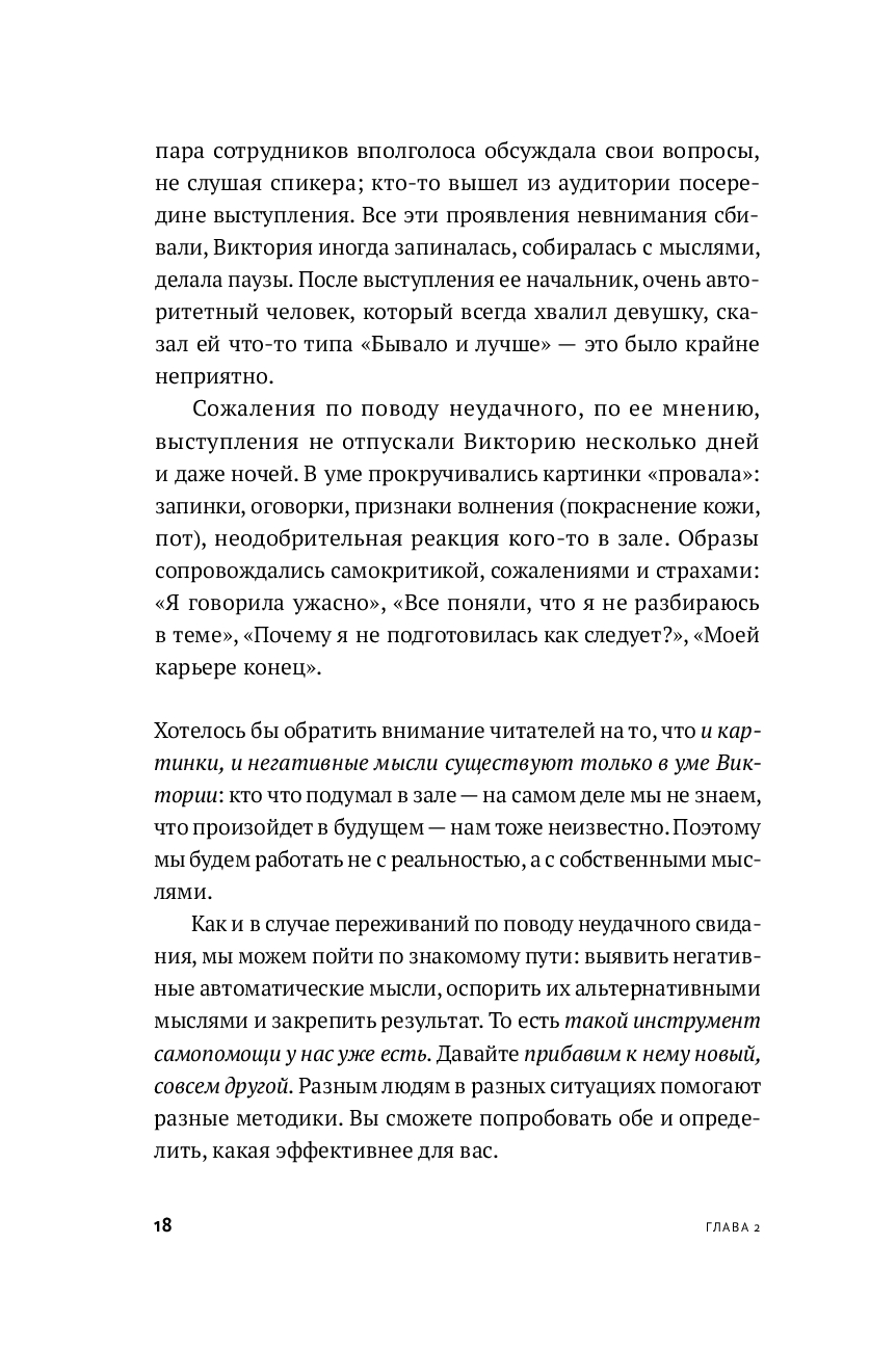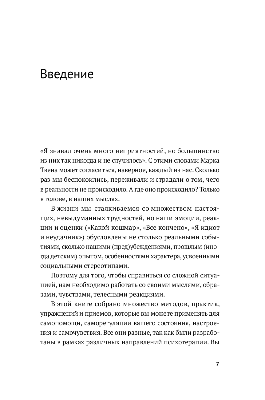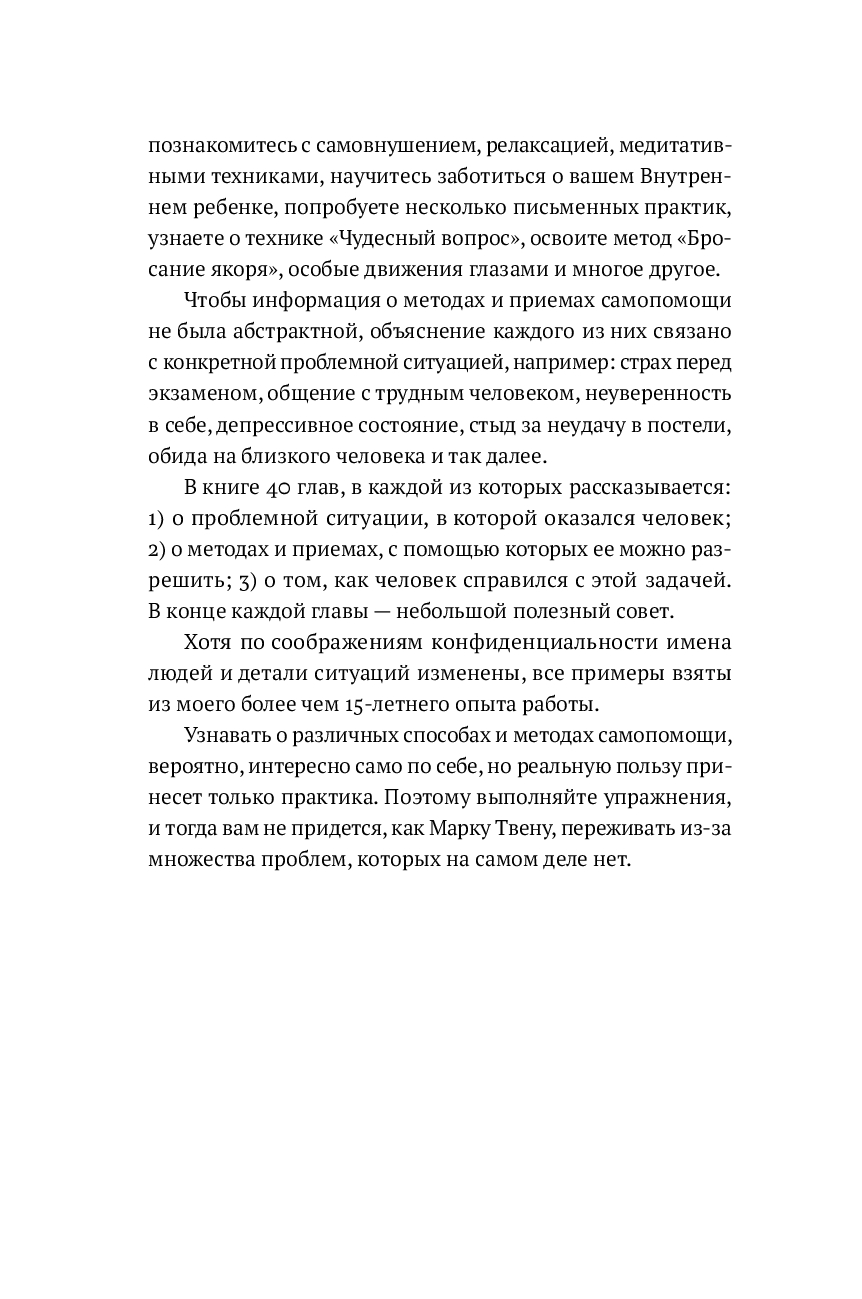 Автор адаптировал лучшие достижения мировой психологии для самостоятельного применения, сделав их доступными и понятными каждому читателю. Вы можете попробовать освоить многие из представленных техник и определить, что помогает именно вам.