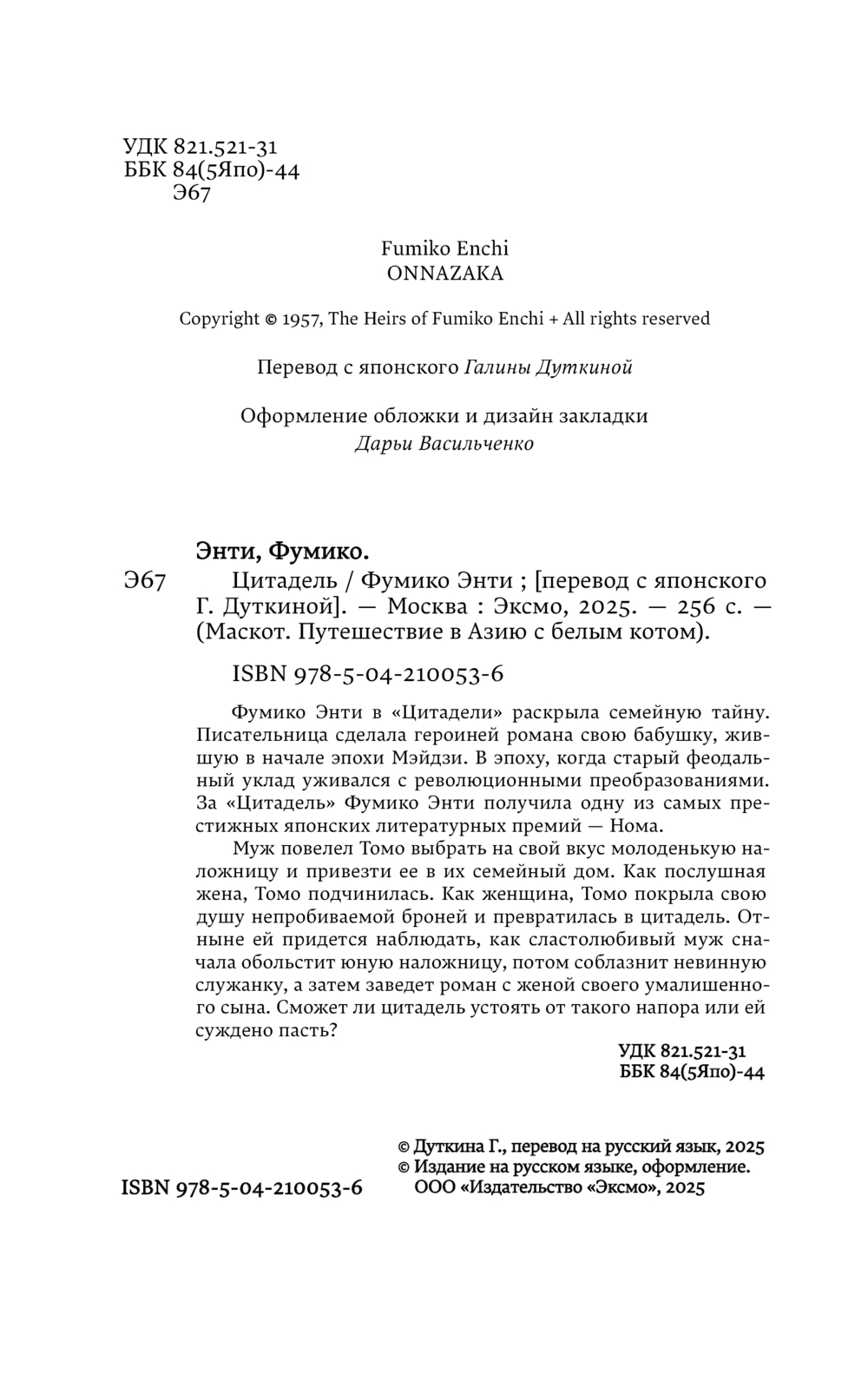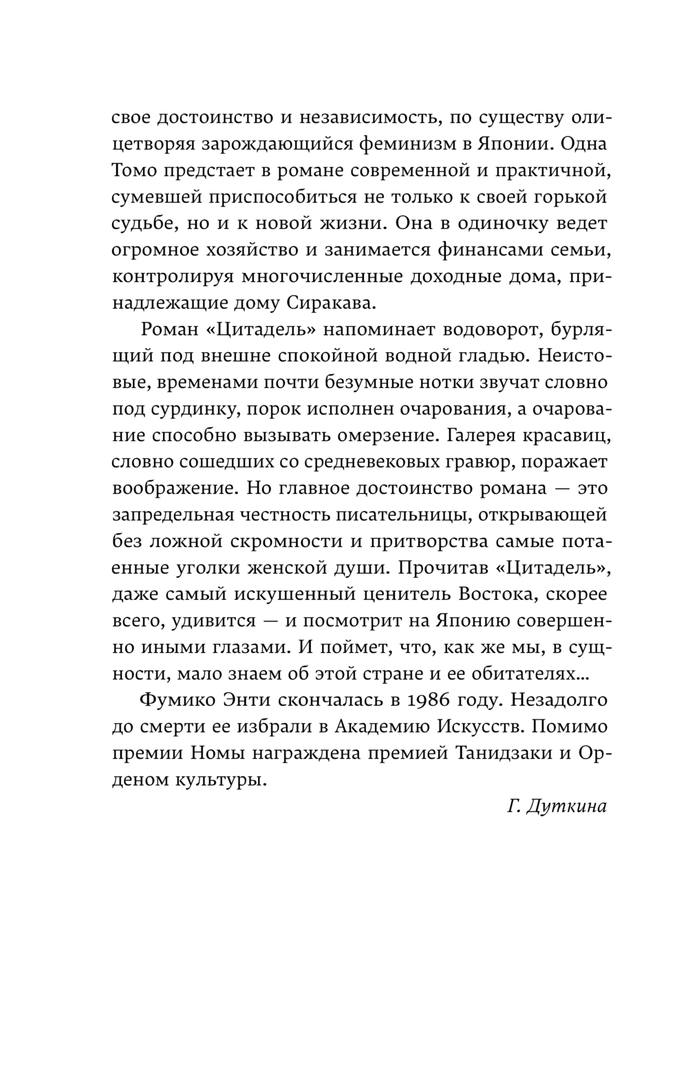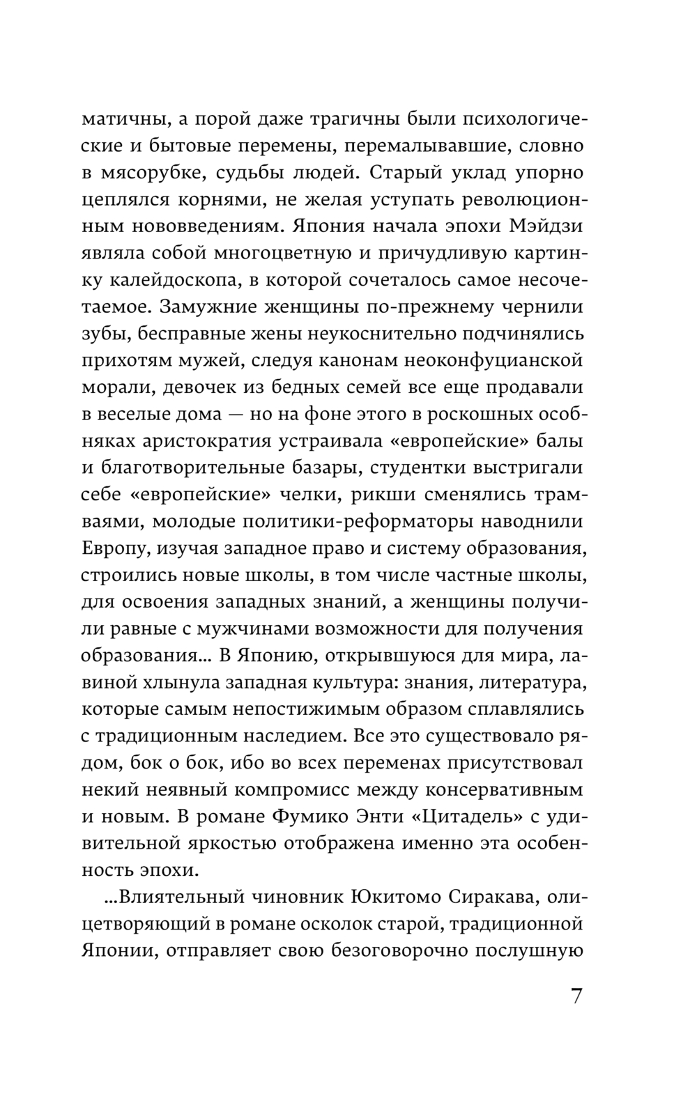 Фумико Энти в "Цитадели" раскрыла семейную тайну. Писательница сделала героиней романа свою бабушку, жившую в начале эпохи Мэйдзи. В эпоху, когда старый феодальный уклад уживался с революционными преобразованиями. За "Цитадель" Фумико Энти получила одну из самых престижных японских литературных премий – Нома.