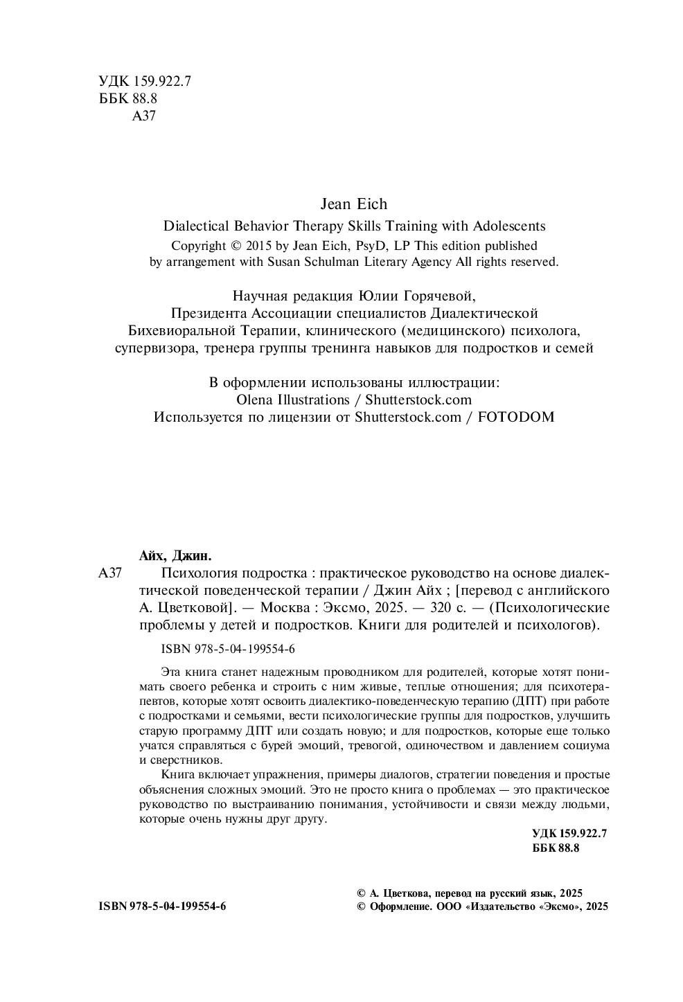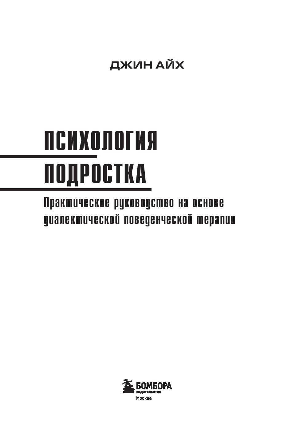 Эта книга станет надежным проводником для родителей, которые хотят понимать своего ребёнка и строить с ним живые, тёплые отношения; для психотерапевтов, которые хотят освоить диалектико-поведенческую терапию (ДПТ) при работе с подростками и семьями, вести психологические группы для подростков, улучшить старую программу ДПТ или создать новую; и для подростков, которые еще только учатся справляться с бурей эмоций, тревогой, одиночеством и давлением социума и сверстников.