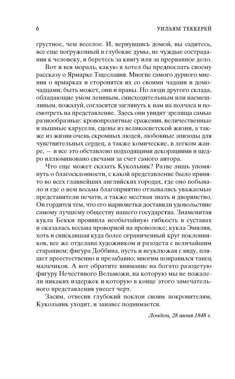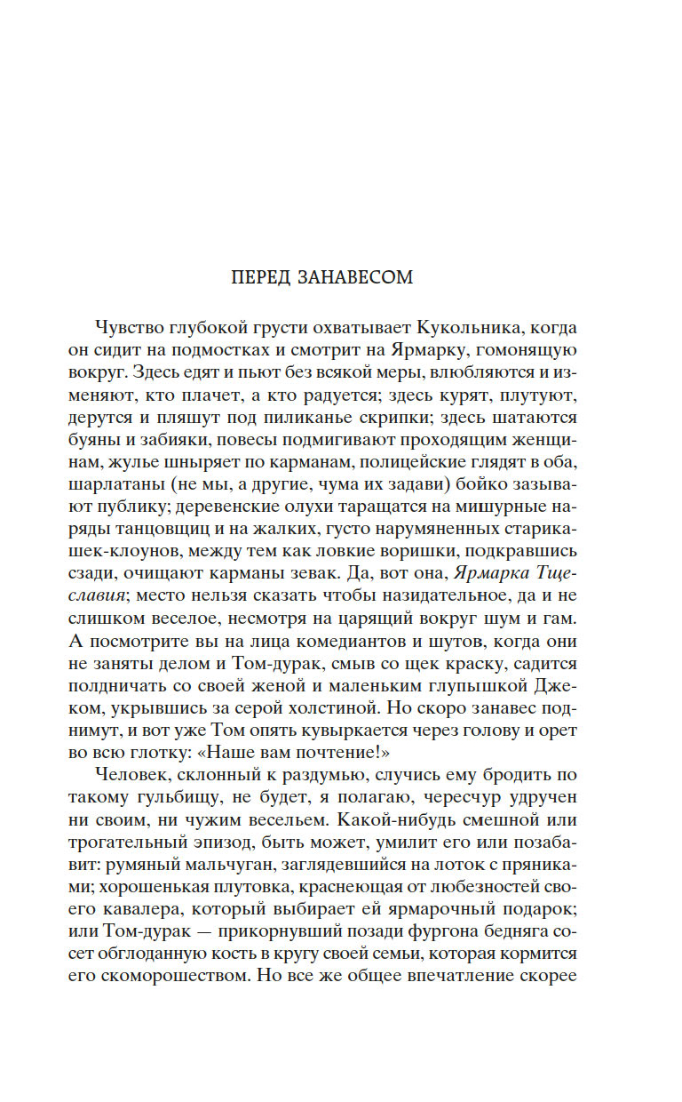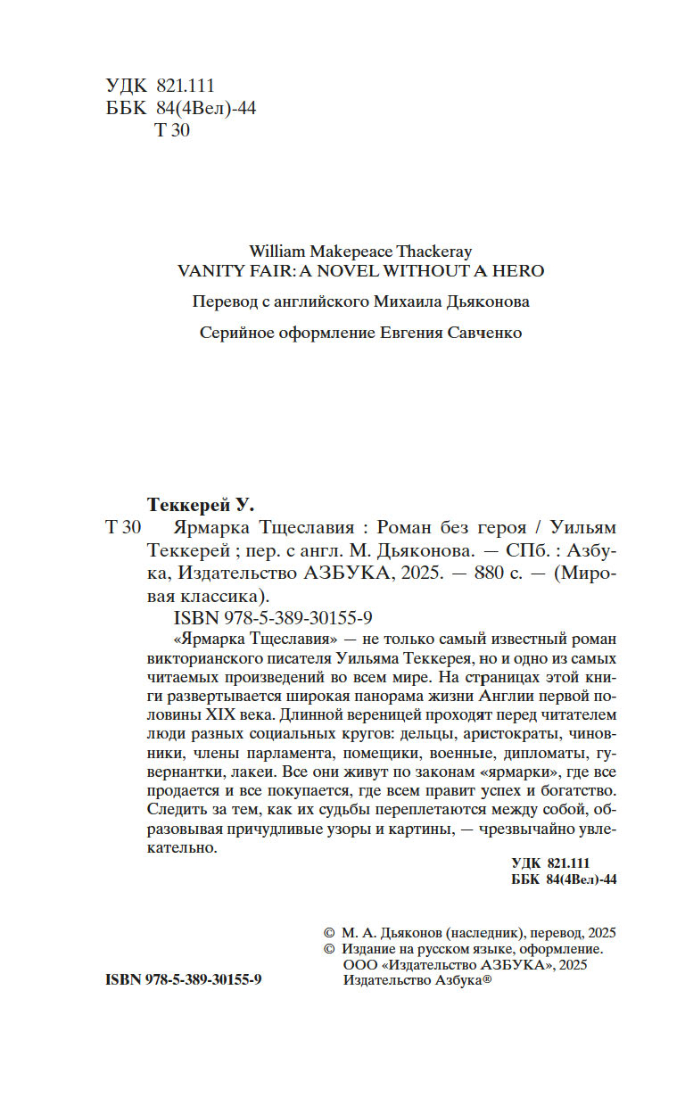 "Ярмарка Тщеславия" – не только самый известный роман викторианского писателя Уильяма Теккерея, но и одно из самых читаемых произведений во всем мире. На страницах этой книги развертывается широкая панорама жизни Англии первой половины XIX века. Длинной вереницей проходят перед читателем люди разных социальных кругов: дельцы, аристократы, чиновники, члены парламента, помещики, военные, дипломаты, гувернантки, лакеи. Все они живут по законам "ярмарки", где все продается и все покупается, где всем правит успех и богатство. Следить за тем, как их судьбы переплетаются между собой, образовывая причудливые узоры и картины, – чрезвычайно увлекательно.