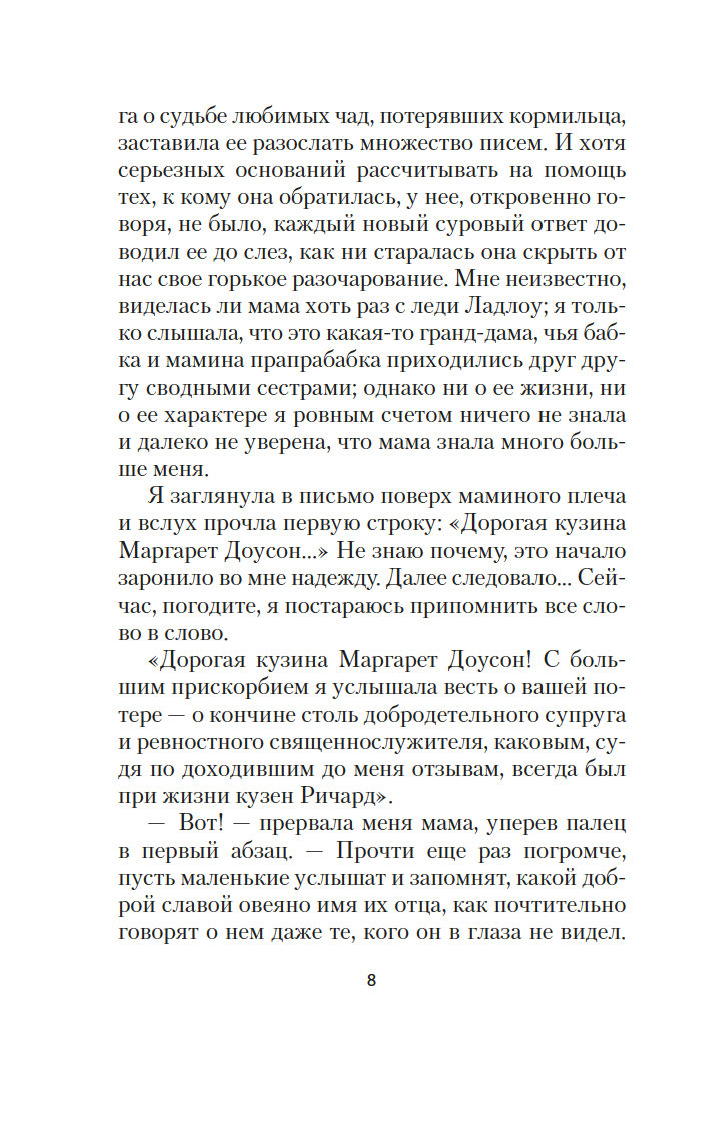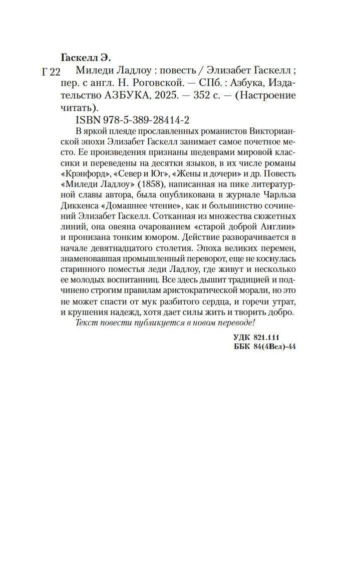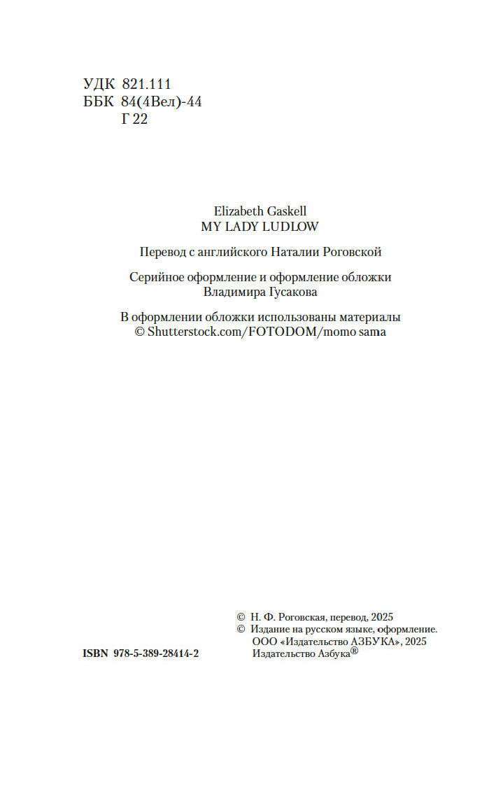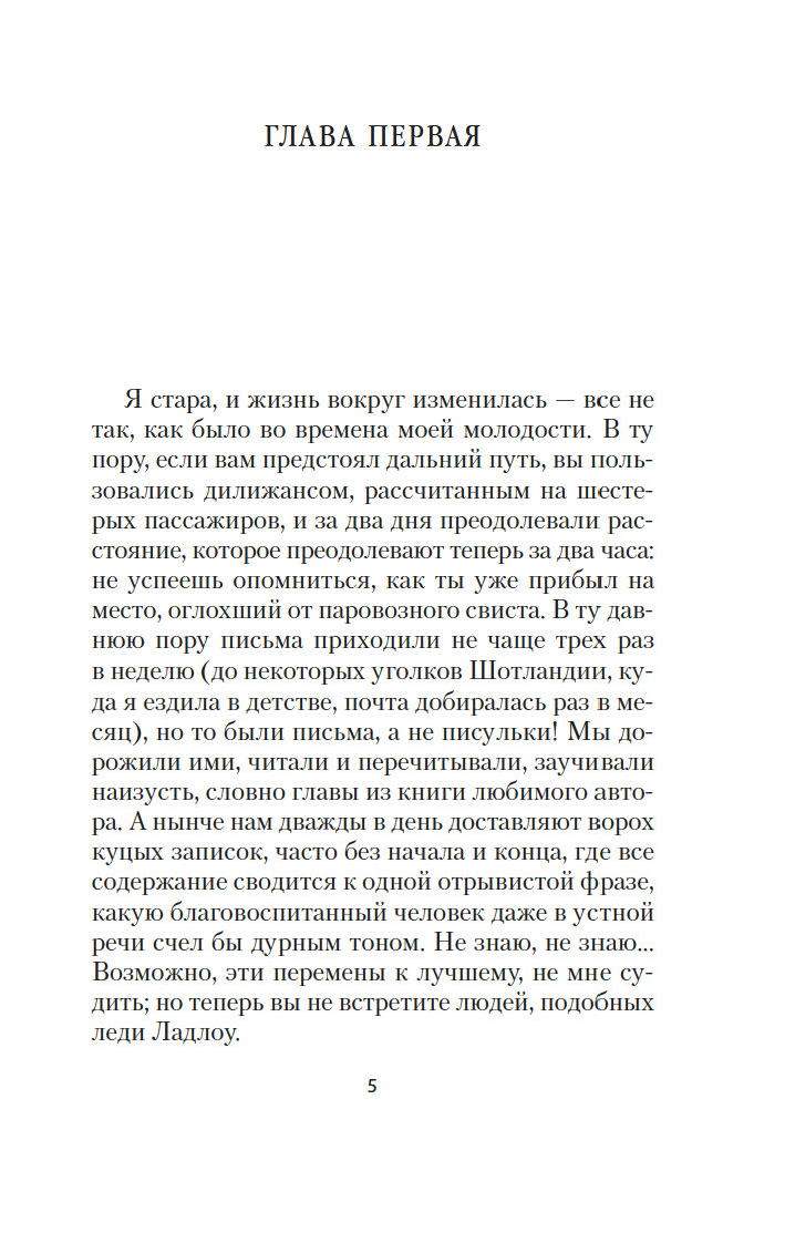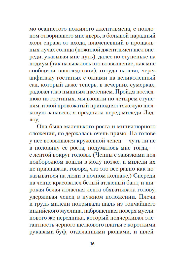 В яркой плеяде прославленных романистов Викторианской эпохи Элизабет Гаскелл занимает самое почетное место. Ее произведения признаны шедеврами мировой классики и переведены на десятки языков, в их числе романы "Крэнфорд", "Север и Юг", "Жены и дочери" и др. Повесть "Миледи Ладлоу" (1858), написанная на пике литературной славы автора, была опубликована в журнале Чарльза Диккенса «Домашнее чтение», как и большинство сочинений Элизабет Гаскелл. Сотканная из множества сюжетных линий, она овеяна очарованием "старой доброй Англии" и пронизана тонким юмором. Действие разворачивается в начале девятнадцатого столетия. Эпоха великих перемен, знаменовавшая промышленный переворот, еще не коснулась старинного поместья леди Ладлоу, где живут и несколько ее молодых воспитанниц. Все здесь дышит традицией и подчинено строгим правилам аристократической морали, но это не может спасти от мук разбитого сердца, и горечи утрат, и крушения надежд, хотя дает силы жить и творить добро.