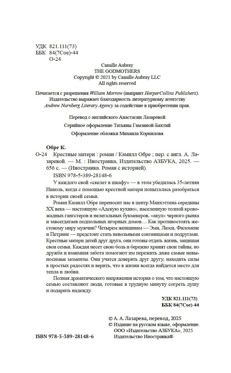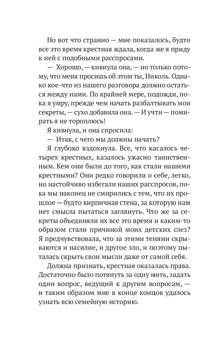 Роман Камилл Обре переносит нас в центр Манхэттена середины XX века – настоящую "Адскую кухню", населенную толпой кровожадных гангстеров и нелегальных букмекеров, "акул" черного рынка и завсегдатаев подпольных игорных домов… Как противостоять жестокому миру мужчин? Четырем женщинам – Эми, Люси, Филомене и Петрине – предстоит стать невольными союзницами и подругами. Крестные матери детей друг друга, они готовы отдать жизнь, защищая свои семьи. Каждая несет свою боль и бережно хранит свои тайны, но дружба и взаимная забота помогают им пережить даже самые невыносимые моменты. Они учатся доверять друг другу, находить силы в простых радостях и верить, что в жизни всегда найдется место для тепла и любви.