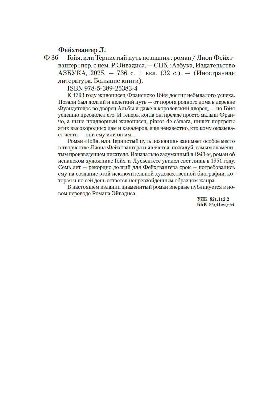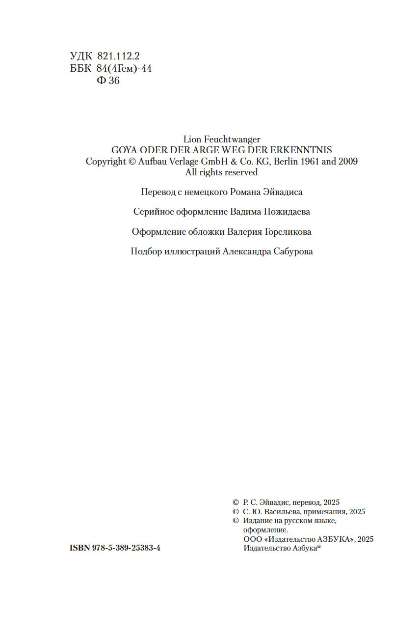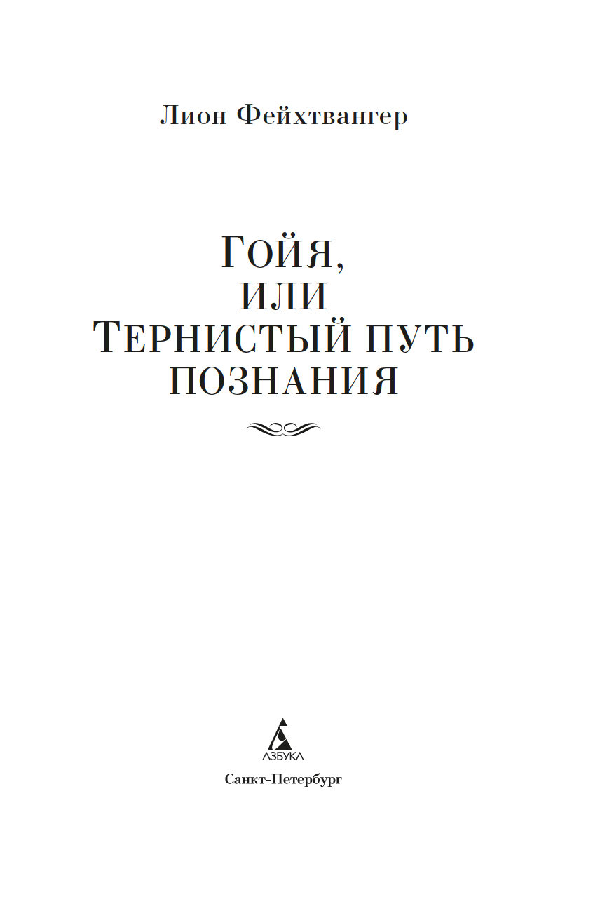 Роман "Гойя, или Тернистый путь познания" занимает особое место в творчестве Лиона Фейхтвангера и является, пожалуй, самым знаменитым произведением писателя. Изначально задуманный в 1943-м, роман об испанском художнике Гойя-и-Лусьентесе увидел свет лишь в 1951 году. Семь лет – рекордно долгий для Фейхтвангера срок – потребовались ему на создание этой исключительной художественной биографии, которая и по сей день остается непревзойденным образцом жанра.