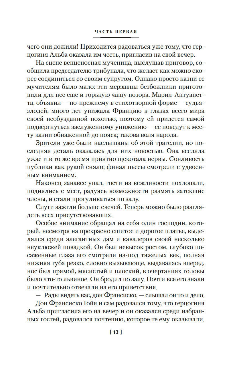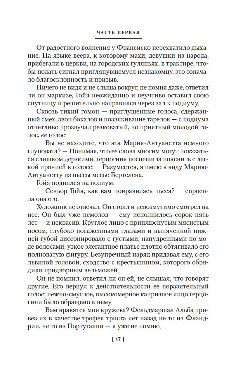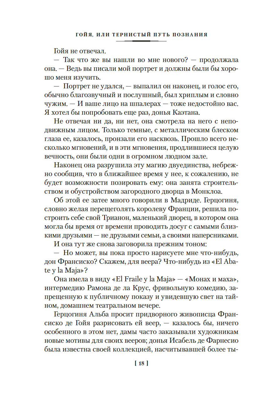 К 1793 году живописец Франсиско Гойя достиг небывалого успеха. Позади был долгий и нелегкий путь – от порога родного дома в деревне Фуэндетодос во дворец Альбы и даже в королевский дворец, – но Гойя успешно преодолел его. И теперь, когда он, прежде просто малыш Франчо, а ныне придворный живописец, pintor de cámara, пишет портреты этих высокородных дам и кавалеров, еще неизвестно, кто кому оказывает честь, – они ему или он им…