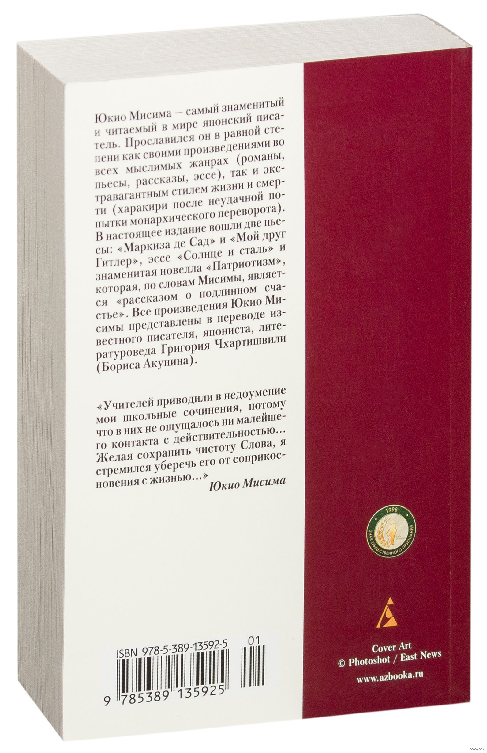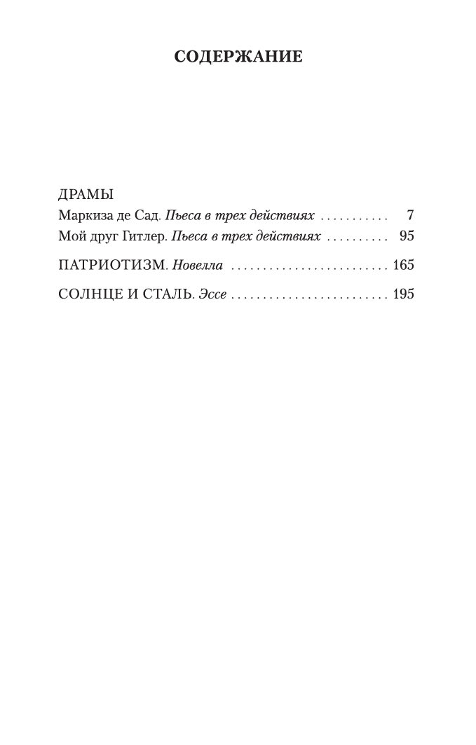Юкио Мисима – самый знаменитый и читаемый в мире японский писатель. Прославился он в равной степени как своими произведениями во всех мыслимых жанрах (романы, пьесы, рассказы, эссе), так и экстравагантным стилем жизни и смерти (харакири после неудачной попытки монархического переворота). В настоящее издание вошли две пьесы "Маркиза де Сад" и "Мой друг Гитлер", эссе "Солнце и сталь" и знаменитая новелла "Патриотизм", которая, по словам Мисимы, является "рассказом о подлинном счастье".