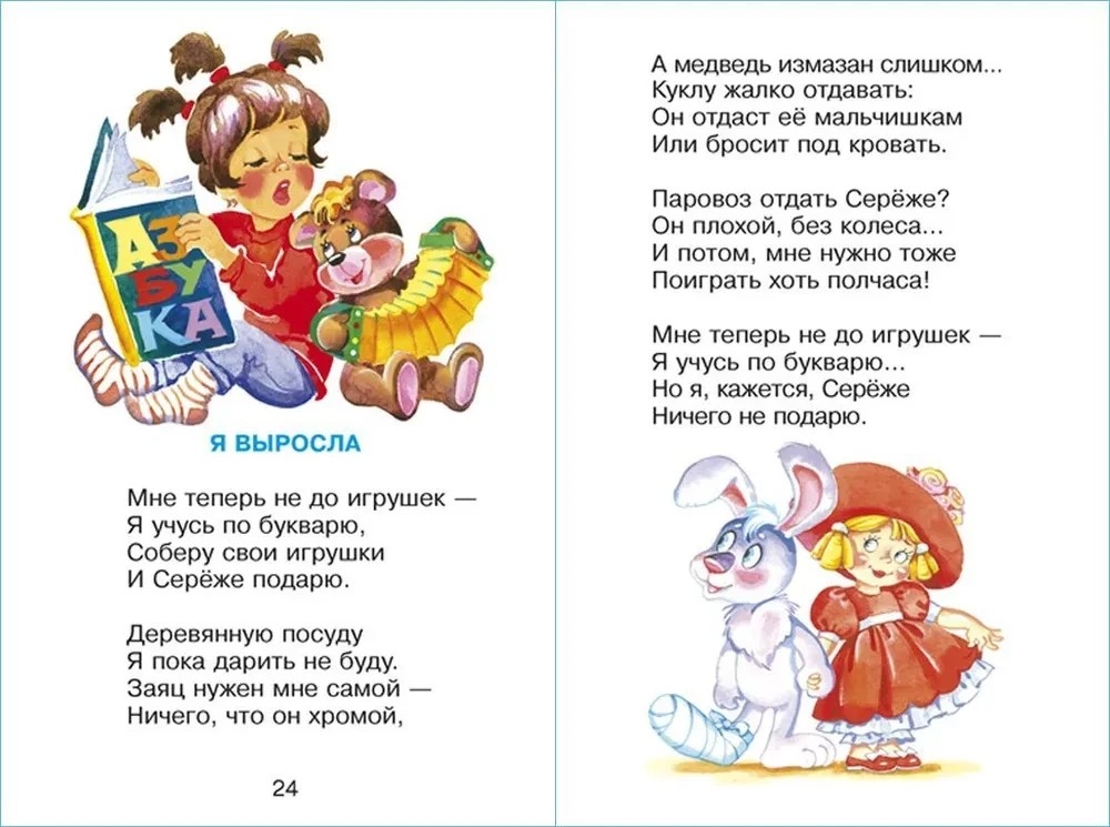 В книгу вошли стихотворения А. Л. Барто про подросших детей и школьников младших классов: "Я выросла", "Песенка про Петю", "Любочка" и другие.