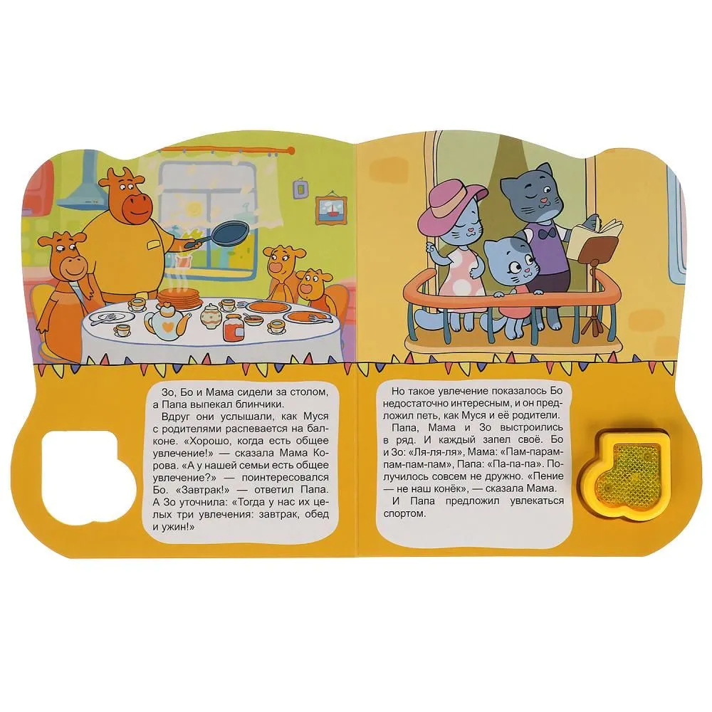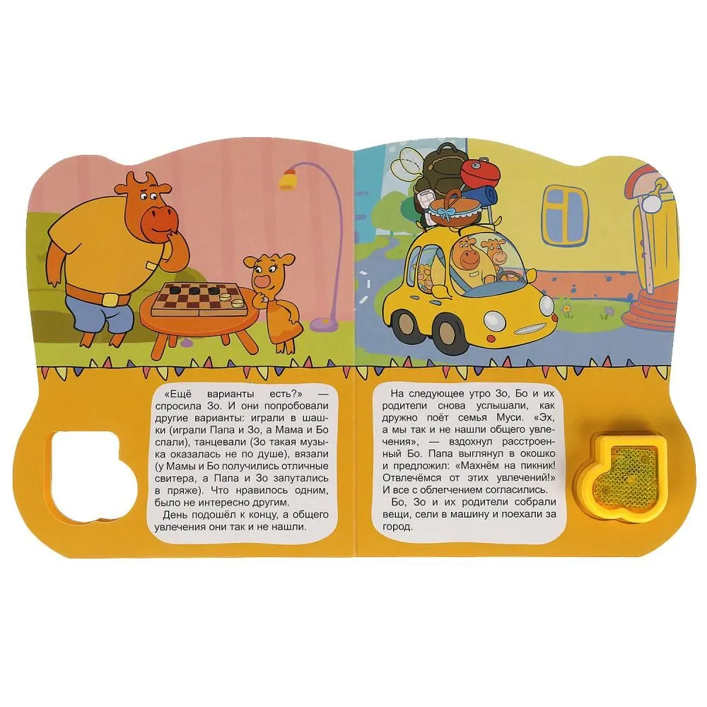 Ребёнок с удовольствием будет листать плотные страницы, рассматривать яркие картинки, вместе с родителями читать увлекательные истории про приключения любимых персонажей и, конечно, нажимать на кнопку с огоньками и слушать весёлые песенки. Малыш легко освоит включение звука: при нажатии на кнопку включится первая песенка, при втором нажатии выключится, в 3-ий раз – заиграет следующая и т.д. Благодаря компактному формату книгу удобно взять с собой в дорогу.