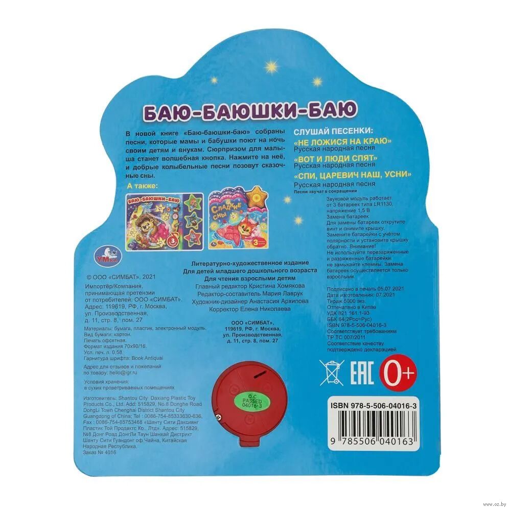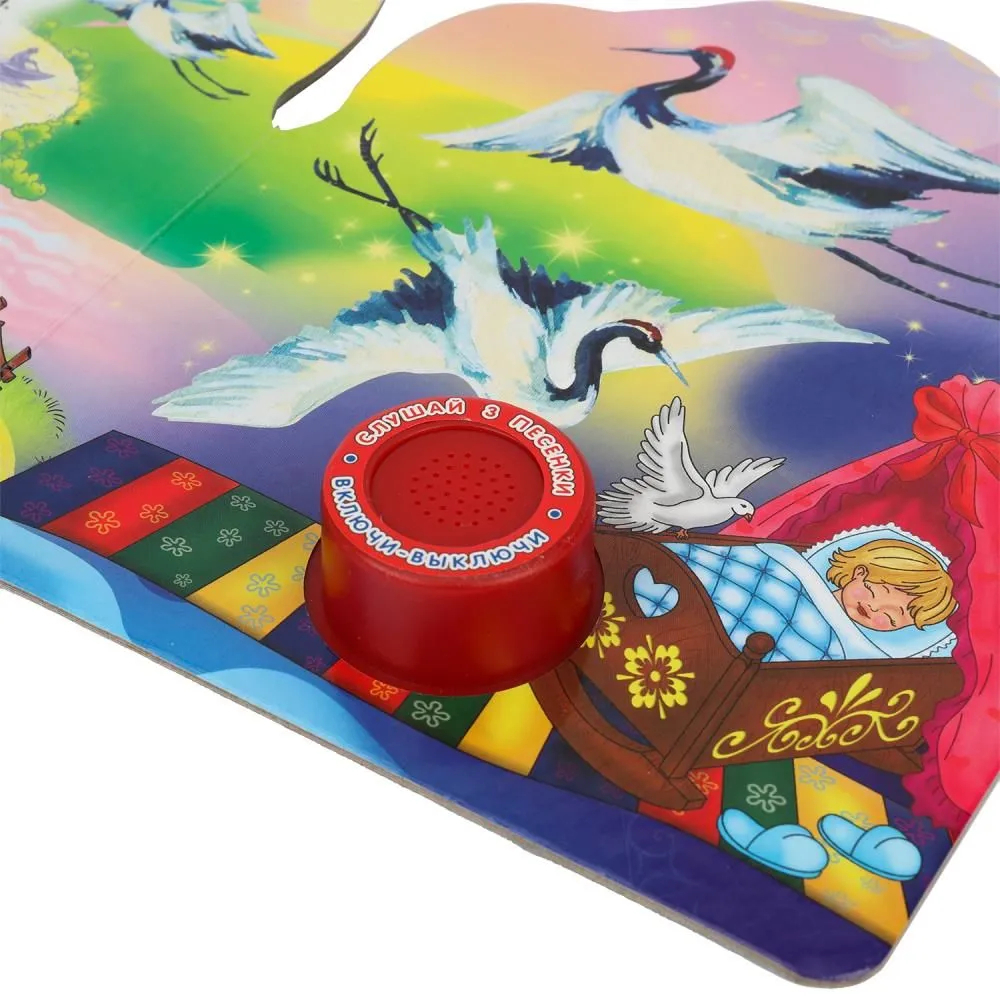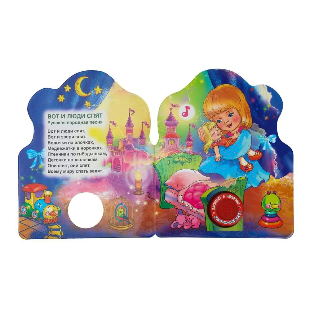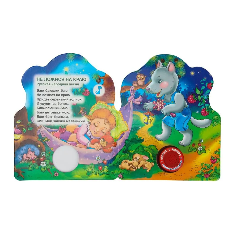 Ребёнок с удовольствием будет листать плотные страницы с яркими картинками, нажимать на кнопку и слушать мелодичные колыбельные песенки. Одно нажатие на кнопку – песенка включится, второе нажатие – выключится и т.д. Книжка сделана из плотного картона, поэтому родители могут не опасаться за её сохранность. Благодаря компактному формату книгу удобно брать с собой в дорогу.
