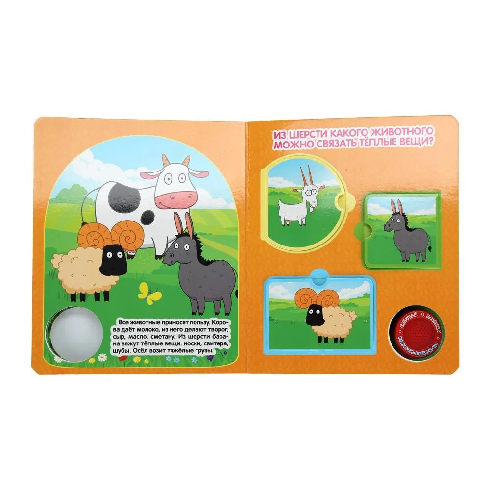Ребенок с удовольствием будет листать плотные страницы, рассматривать яркие картинки, открывать окошки и смотреть, кто там спрятался, а также нажимать на кнопку и слушать веселые песенки. Малыш легко освоит включение звука: по нажатию на кнопку включится первая песенка, при втором нажатии выключится, в 3-ий раз – заиграет следующая песенка и т.д. Благодаря компактному формату книгу удобно взять с собой в дорогу.