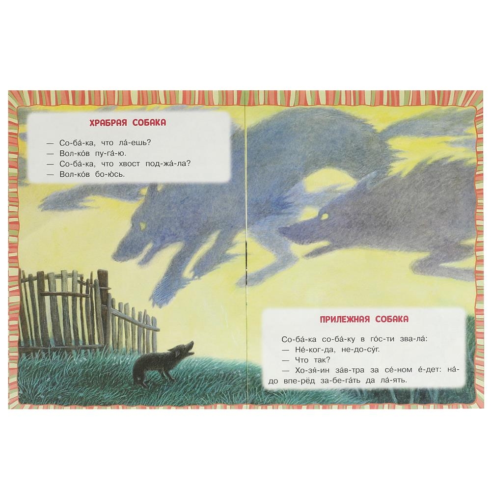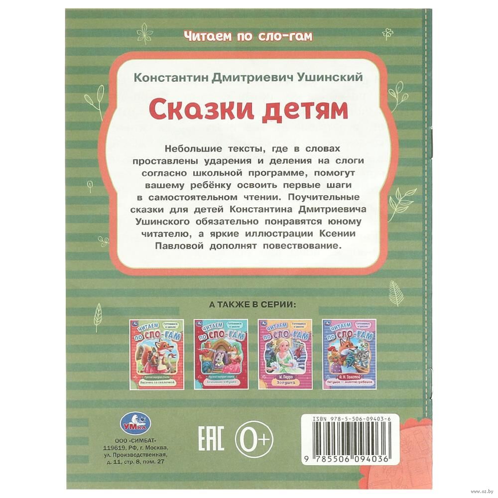 Эта книга-брошюра поможет юному читателю слог за слогом освоить первые шаги в самостоятельном чтении. В ней он найдёт небольшой текст, где в словах проставлены ударения и деления на слоги согласно школьной программе. Интересные сказки известного русского писателя Константина Дмитриевича Ушинского увлекут ребёнка в волшебную страну книг.