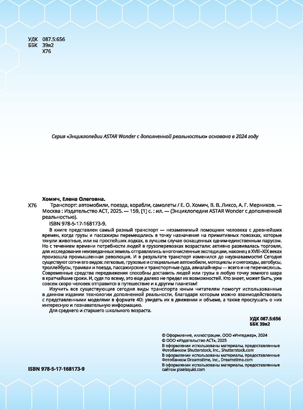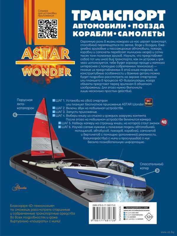 Изучить все существующие сегодня виды транспорта юным читателям помогут использованные в данном издании технологии дополненной реальности, благодаря которым можно взаимодействовать с представленными моделями в формате 4D: увидеть их в движении и объеме, а также прослушать о них интересную и познавательную информацию.