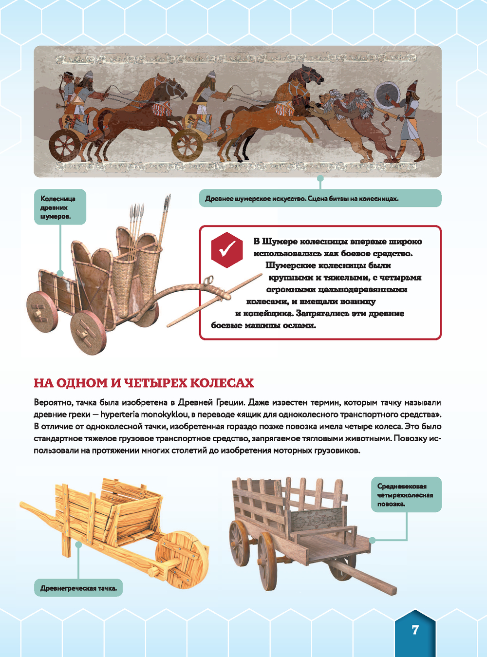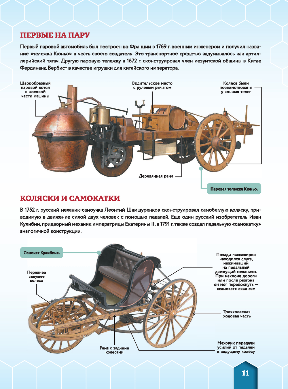 В книге представлен самый разный транспорт – незаменимый помощник человека с древнейших времен, когда грузы и пассажиры перемещались в точку назначения на примитивных повозках, которые тянули животные, или на простейших лодках, в лучшем случае оснащенных одним-единственным парусом. Но с течением времени потребности людей в грузоперевозках возрастали: активно развивалась торговля, для исследования неизведанных земель отправлялись многочисленные экспедиции, наконец в XVIII—XIX веках произошла промышленная революция. И в результате транспорт изменился до неузнаваемости!