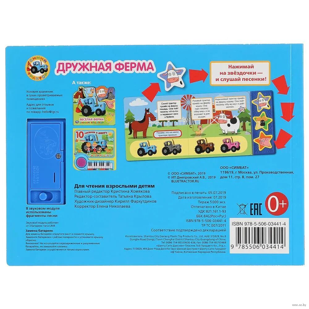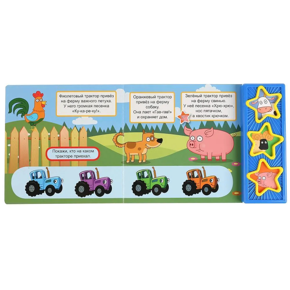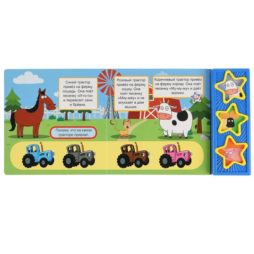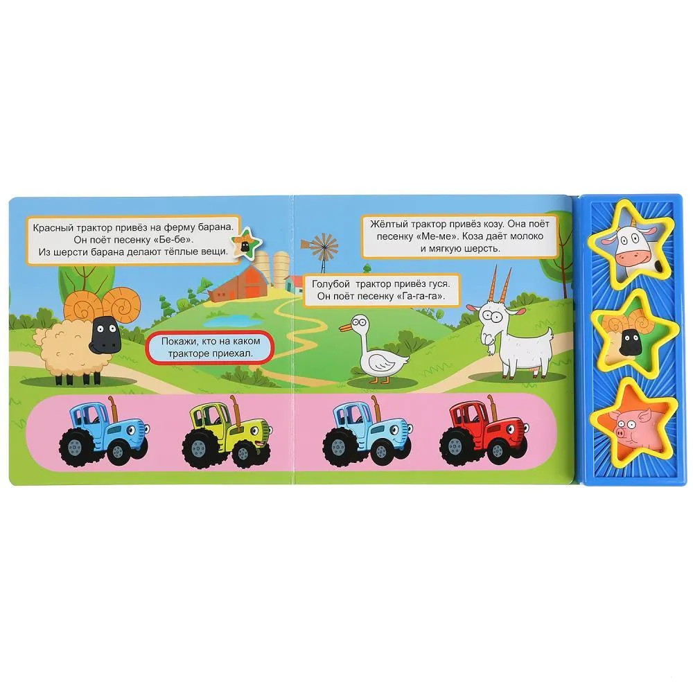 Ребёнок с удовольствием будет листать плотные страницы, рассматривать яркие картинки, вместе с родителями читать про приключения любимого героя на ферме и, конечно, нажимать на кнопки и слушать весёлые песенки из м/ф. Малыш легко освоит включение звука: по нажатию на кнопку песенка включится, при втором нажатии выключится. Благодаря компактному размеру книгу удобно взять с собой в дорогу.