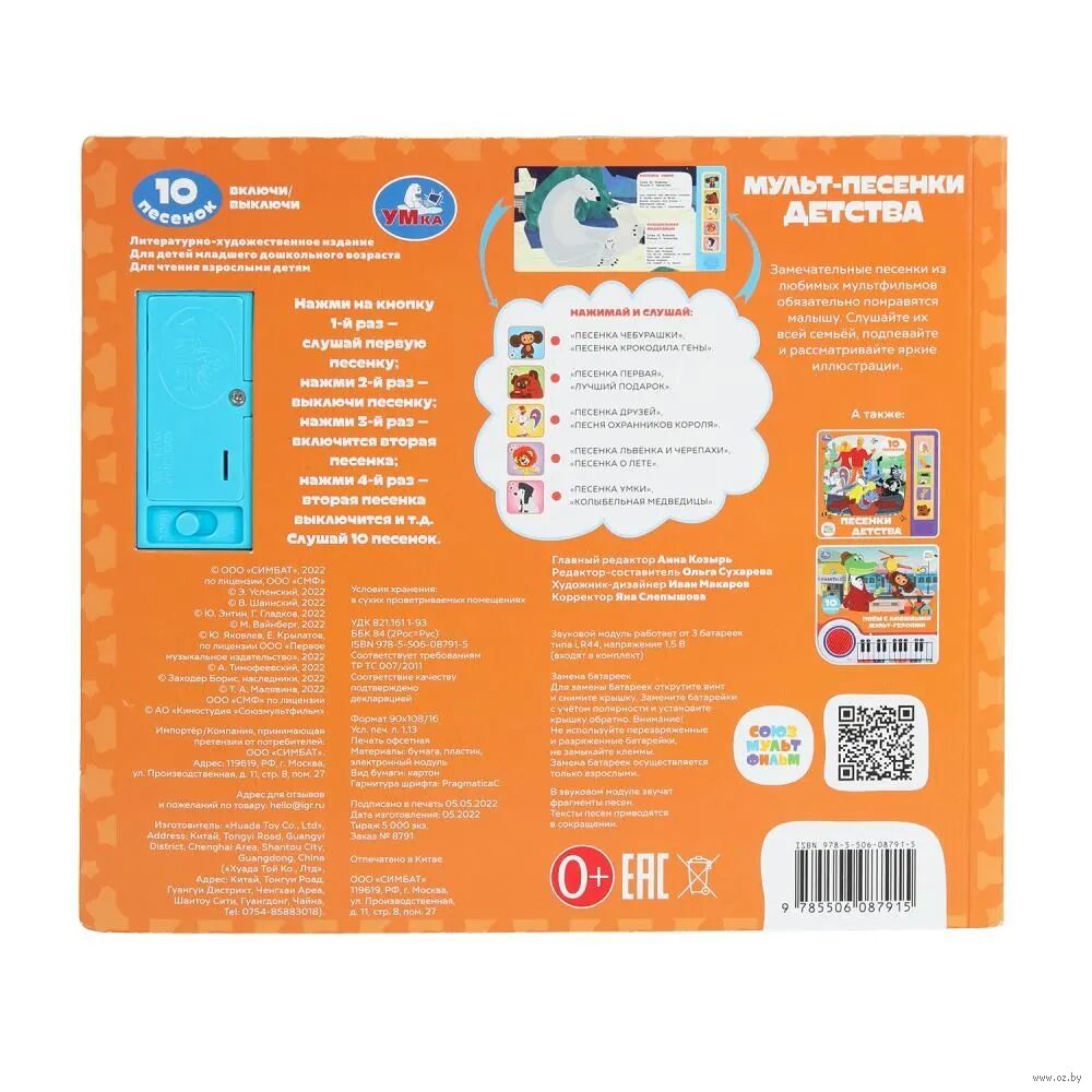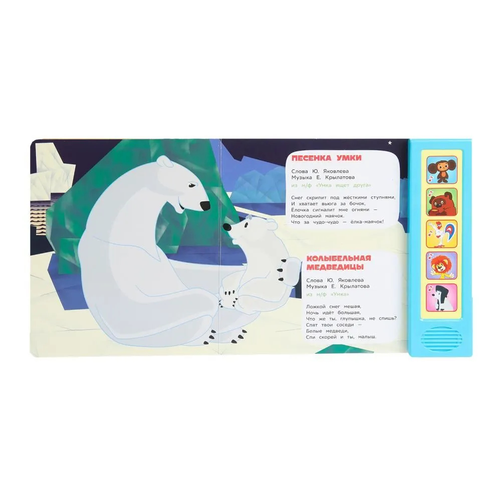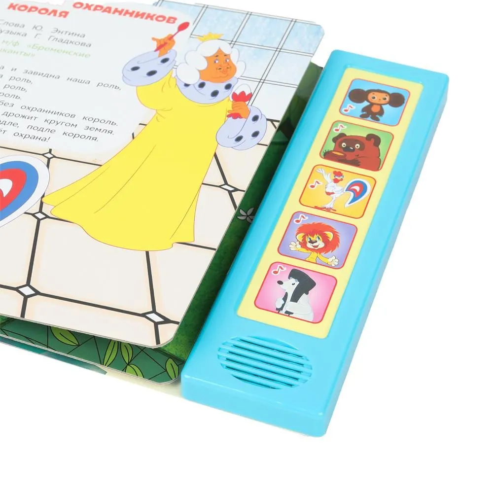 Малыш с удовольствием будет листать плотные страницы, рассматривать яркие иллюстрации, нажимать на звуковые кнопки и слушать весёлые песенки. Он легко освоит включение звука: по нажатию на кнопку звук включится, при втором нажатии выключится. На каждой кнопочке записано по 2 песенки. Книга сделана из плотного картона, поэтому родители могут не опасаться, что ребёнок порвёт странички. Благодаря удобному формату книгу можно взять с собой в путешествие.