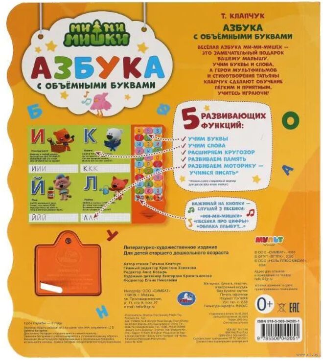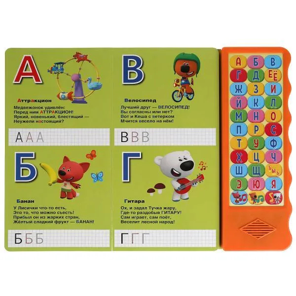 Эта яркая энциклопедия непременно привлечёт внимание малыша красивыми картинками, объёмными буквами и звуковыми кнопками. Он с удовольствием будет листать яркие страницы, слушать интересные стихи, песенки из любимого мультсериала и учиться. Книга сделана из плотного картона, поэтому мамы могут не опасаться, что ребёнок порвёт странички.