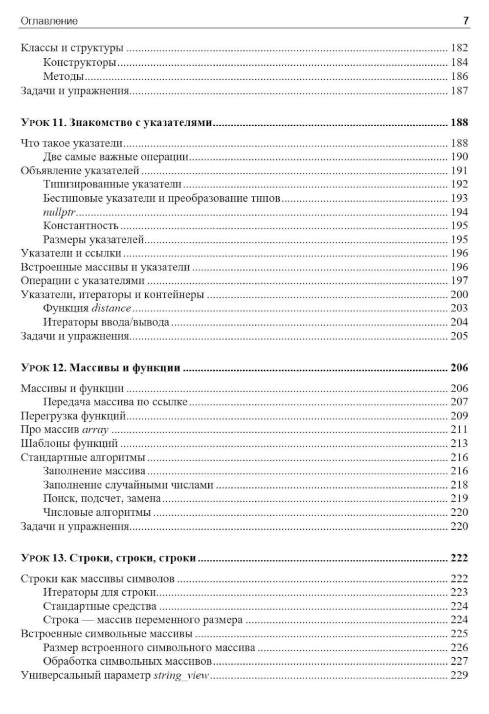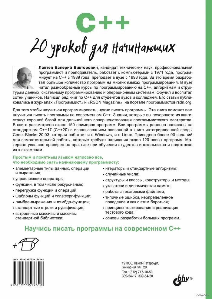 Даны основы программирования на С++ по стандартам С++17 и С++20, базовые структуры данных и методы работы с ними. С позиций разработки ПО рассмотрено программирование функций: обычных и рекурсивных, constexpr-функций, лямбда-выражений и лямбда-функций, перегрузка и шаблоны функций. Раскрыты более сложные вопросы С++: указатели и динамическая память, структуры и классы, конструкторы и деструкторы, методы и перегрузка операций, работа с текстовыми файлами, устройство чисел и битовые операции.