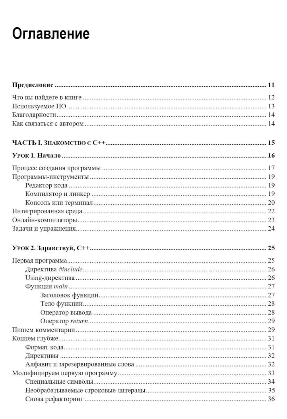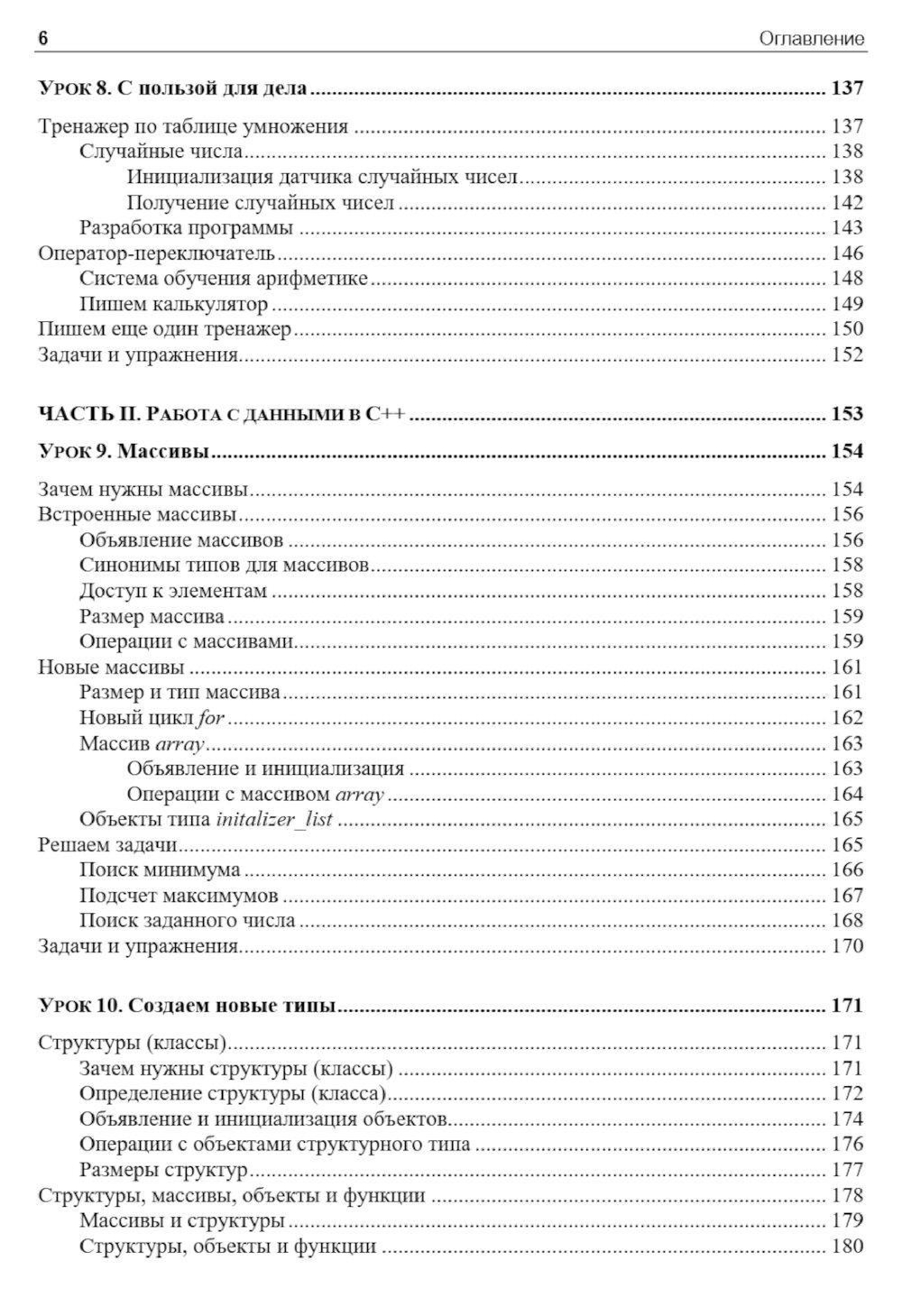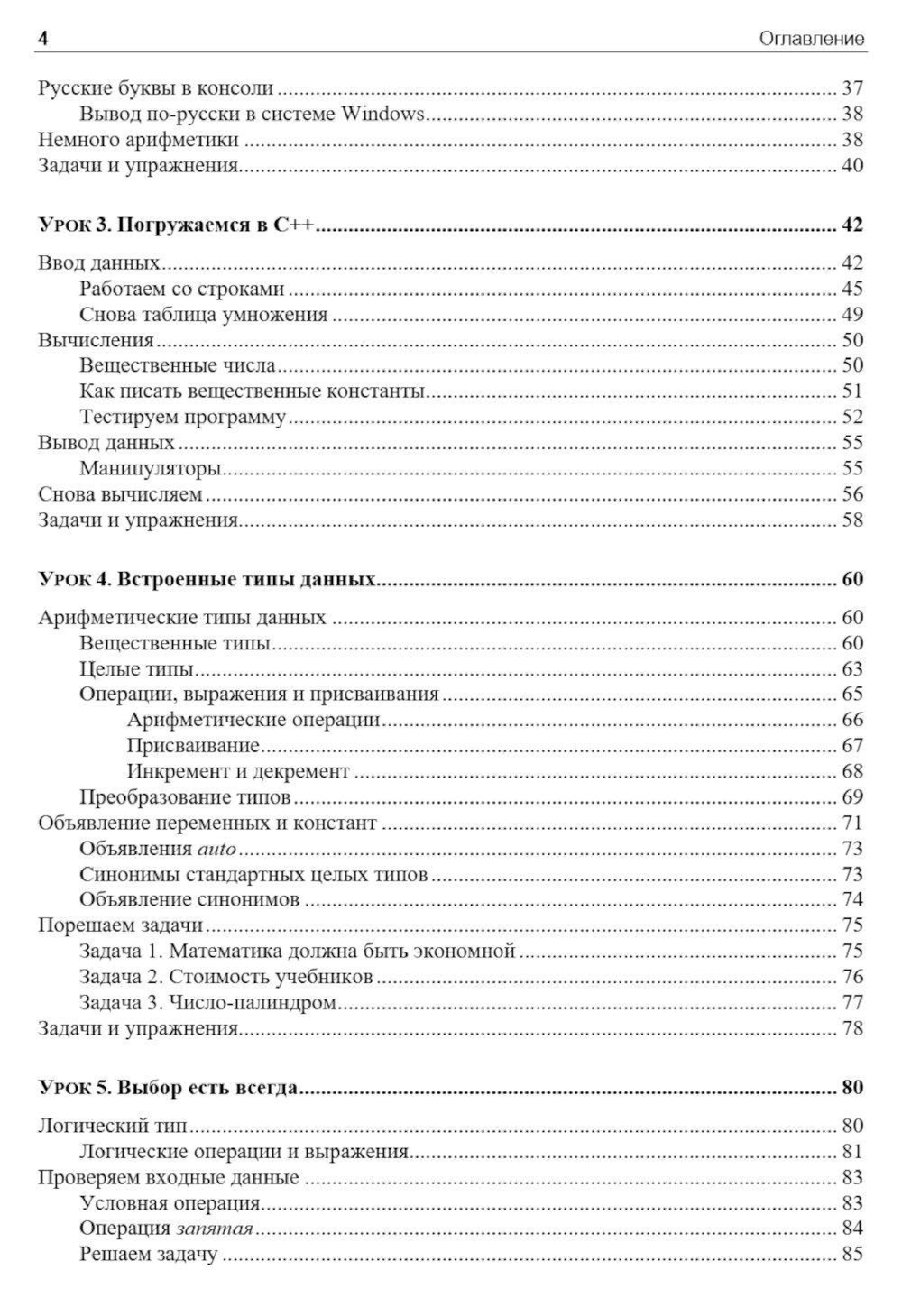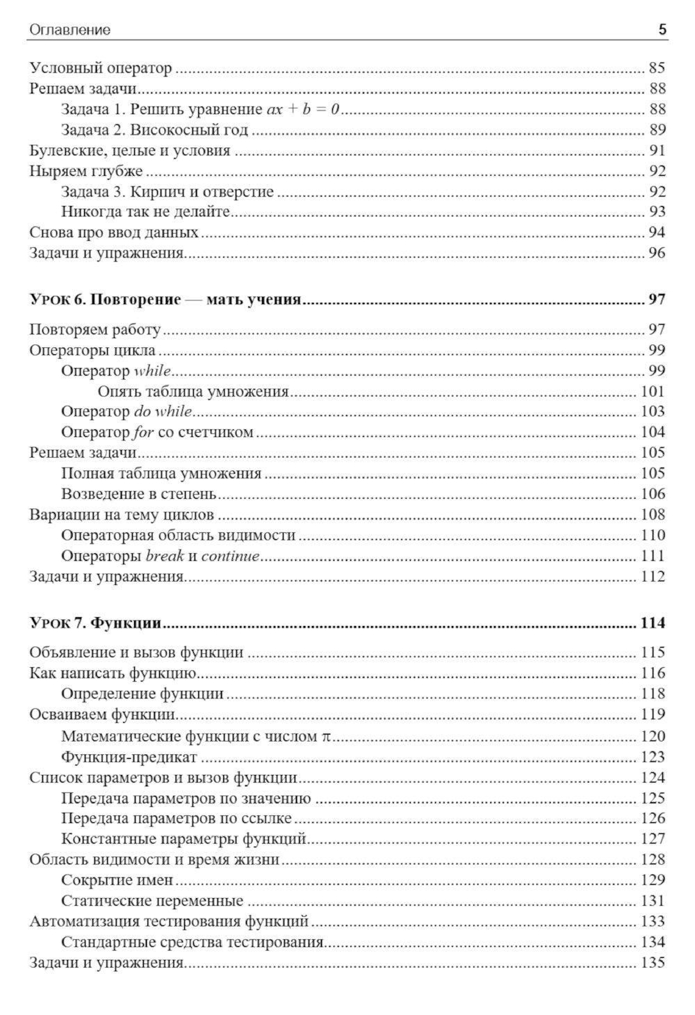 Рассмотрены важные для начинающих темы: интегрированная среда Code: Blocks, русификация ввода и вывода, ошибки при написании кода, неопределенное поведение, тестирование и написание тестового кода. В книге 150 примеров программ и более 90 заданий для самостоятельной работы. Материал проверен на практике при обучении студентов и школьников и подготовке их к экзаменам. Электронное приложение-архив на сайте издательства содержит исходные коды всех примеров.