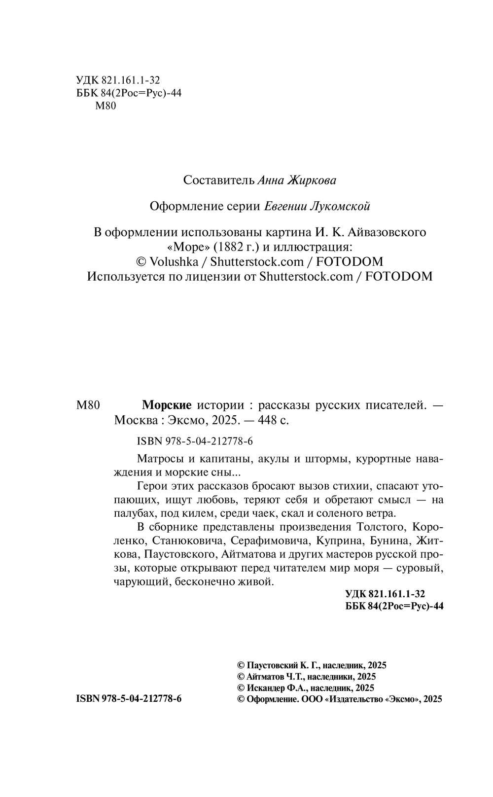 В сборнике представлены произведения Толстого, Короленко, Станюковича, Серафимовича, Куприна, Бунина, Житкова, Паустовского, Айтматова и других мастеров русской прозы, которые открывают перед читателем мир моря – суровый, чарующий, бесконечно живой.