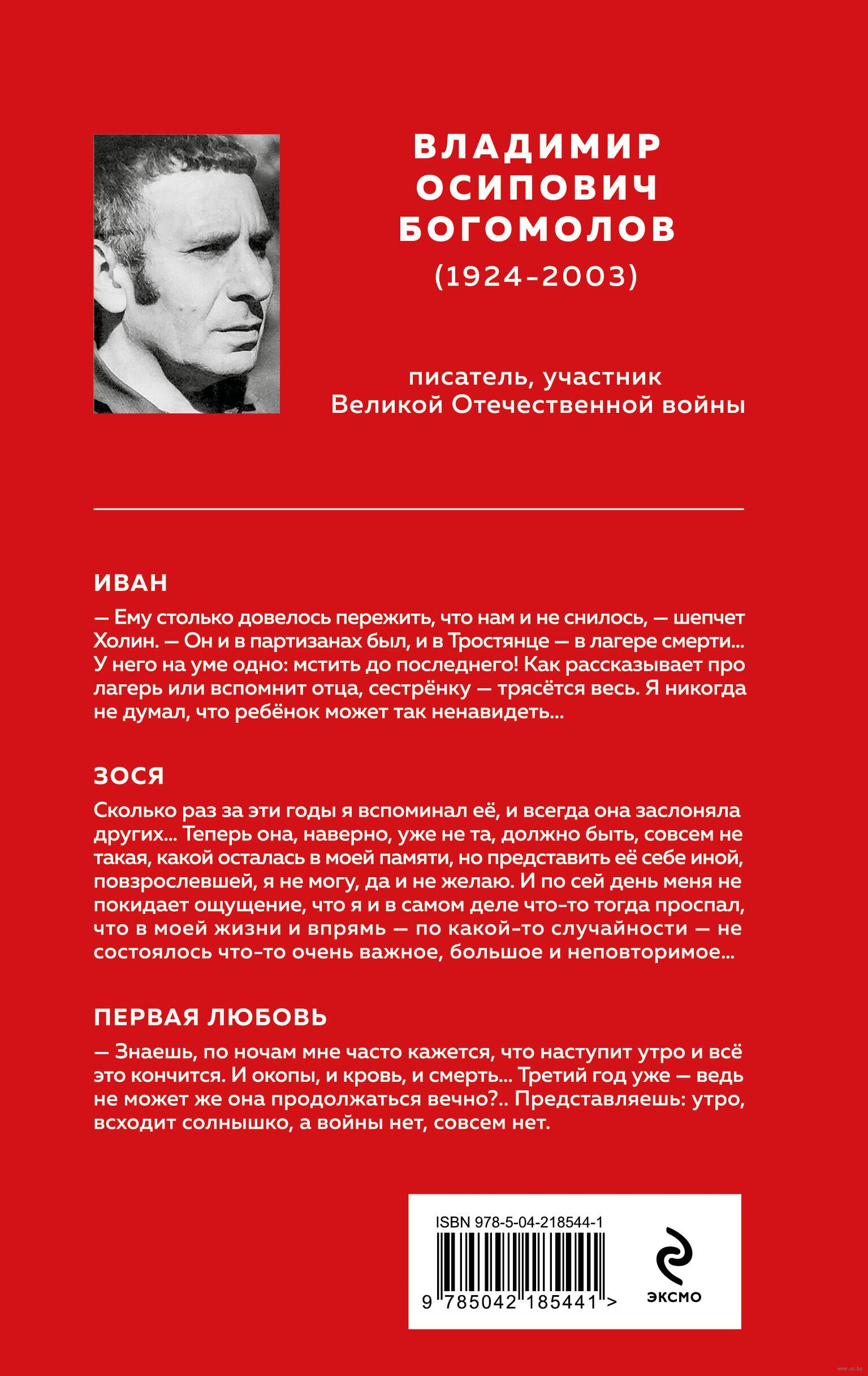 В книгу вошли военные произведения Владимира Богомолова: повести "Иван" (о судьбе мальчика-сироты, чье детство опалила война) и "Зося" (о кратком миге любви и надежды перед отправкой на фронт), а также рассказы "Первая любовь", "Кладбище под Белостоком", "Второй сорт", "Кругом люди" и "Сердца моего боль".