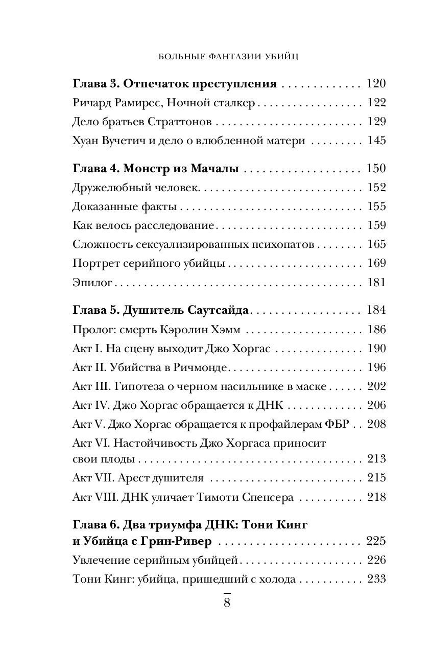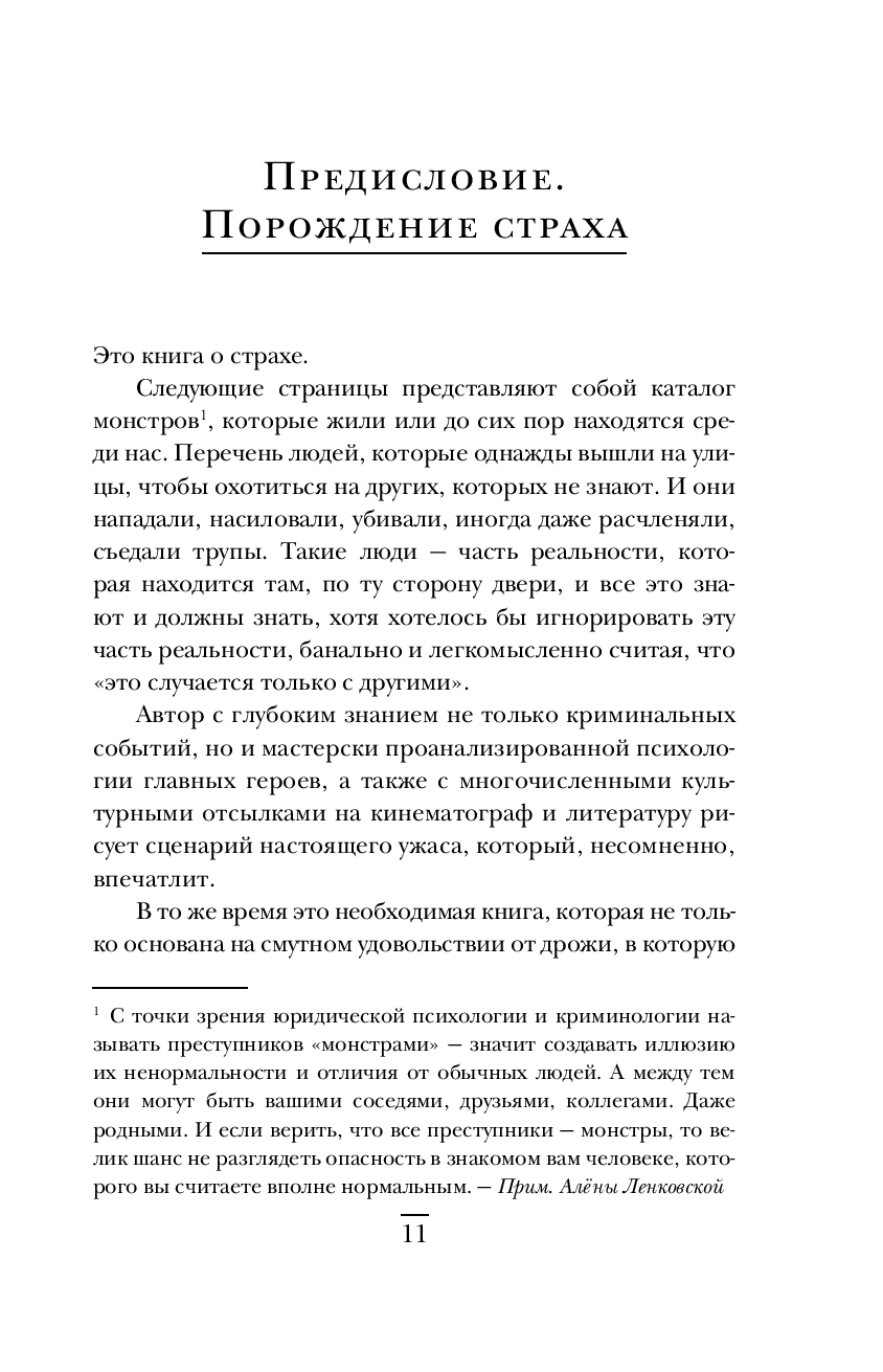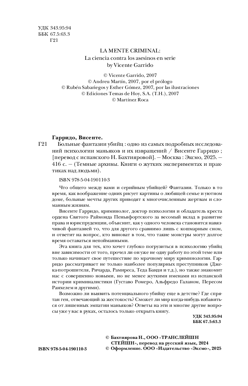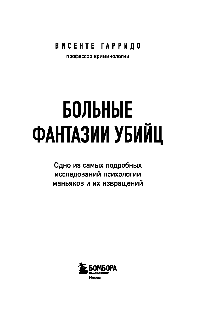 Эта книга для тех, кто хочет глубоко погрузиться в психологию убийц вне зависимости от того, прочел ли он уже не одну работу по этой теме или только начинает свое путешествие по мрачному миру криминологии. Гарридо рассматривает не только наиболее популярных преступников (Джека-Потрошителя, Ричарда, Рамиреса, Теда Банди и т.д.), но также знакомит нас с совершенно новыми, но не менее жуткими именами из испанской истории криминалистики (Густаво Ромеро, Альфредо Галаной, Перес Ранхелем и другими).