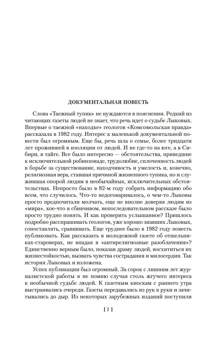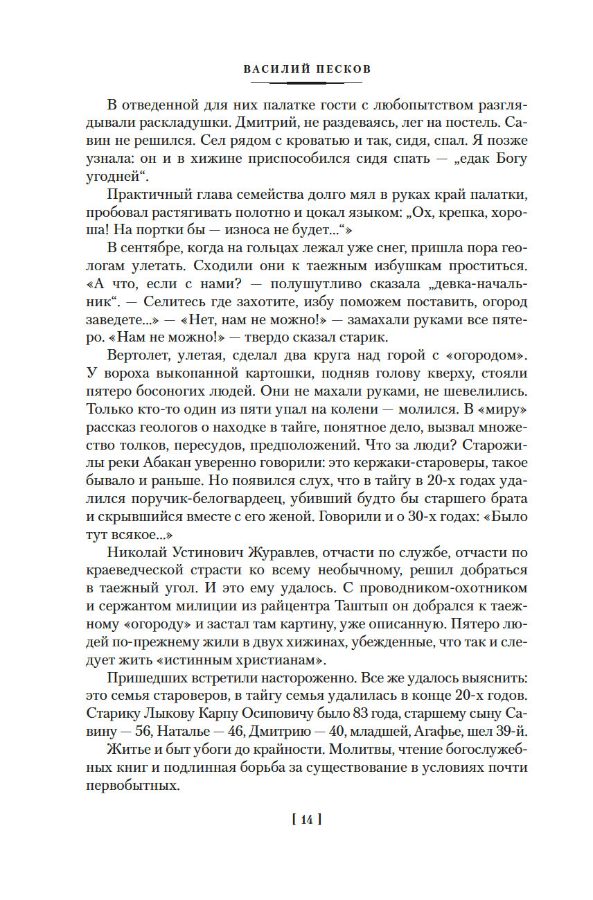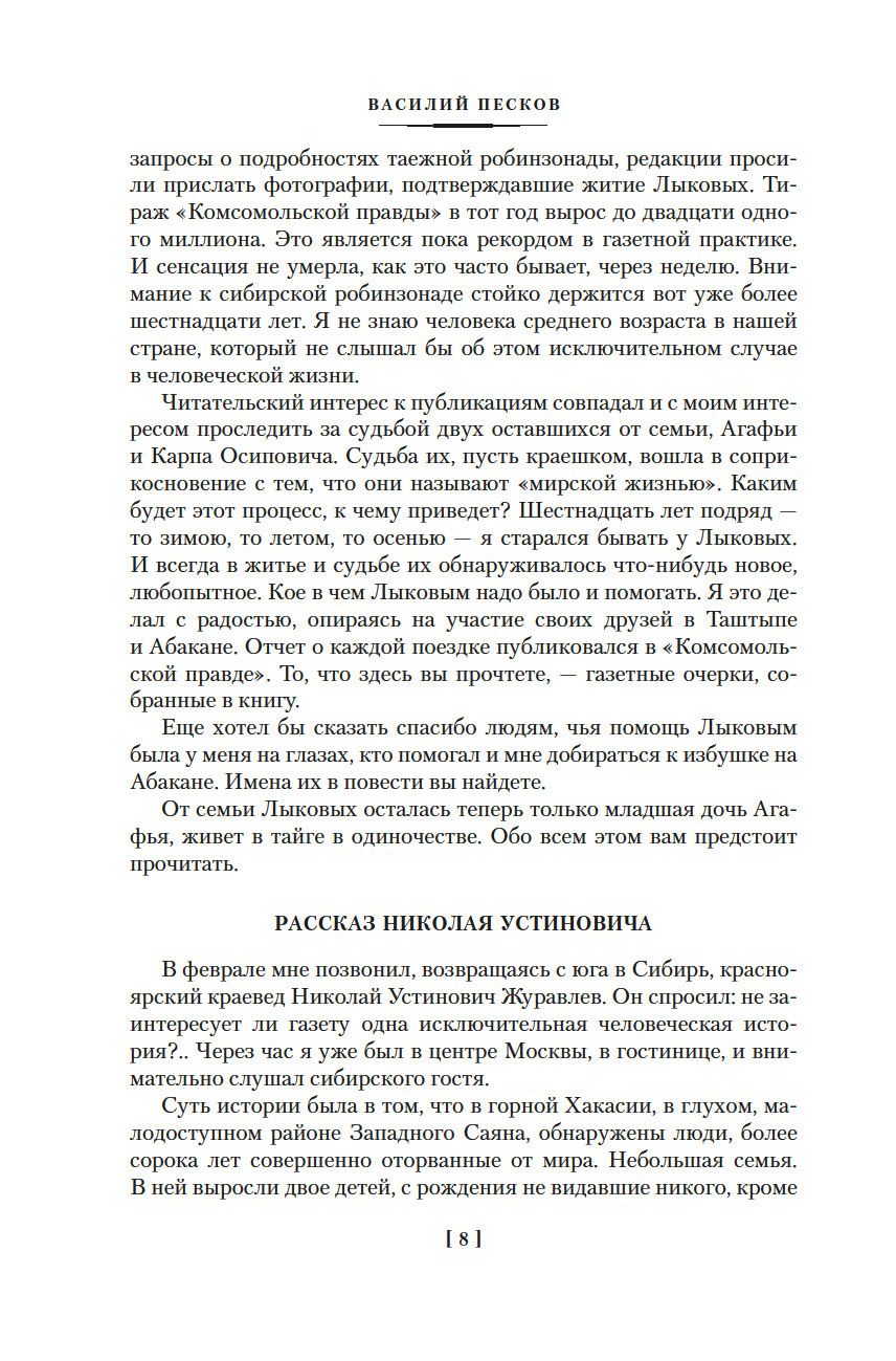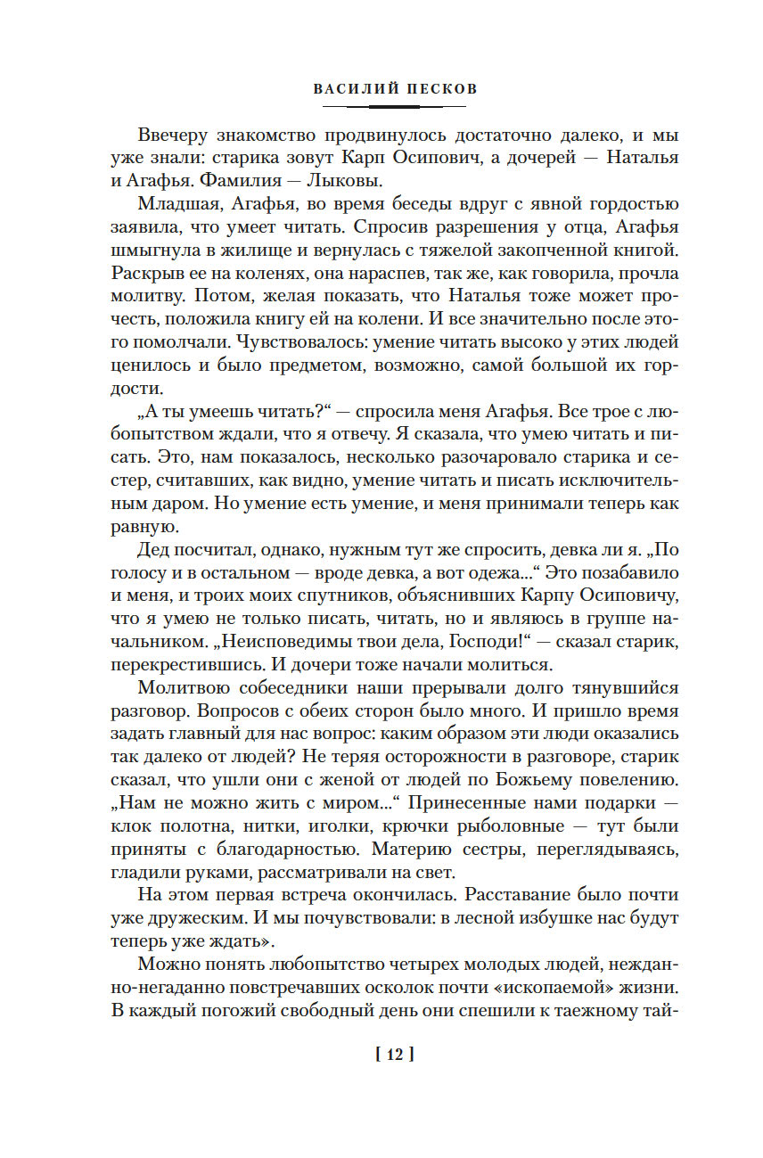 Когда в 1978 году геологи случайно обнаружили на реке Абакан заимку отшельников Лыковых, Василий Михайлович Песков был первым репортером, осветившим эту историю, и с тех пор не оставлял таежных робинзонов своим вниманием, сделавшись летописцем семьи. Его очерки вызвали огромный резонанс в советской прессе и принесли автору мировую известность. Со временем они сложились в документальную повесть "Таежный тупик", удивительная история старообрядцев Лыковых и их младшей дочери Агафьи стала своеобразным документом эпохи, открыв огромный пласт народной истории страны.