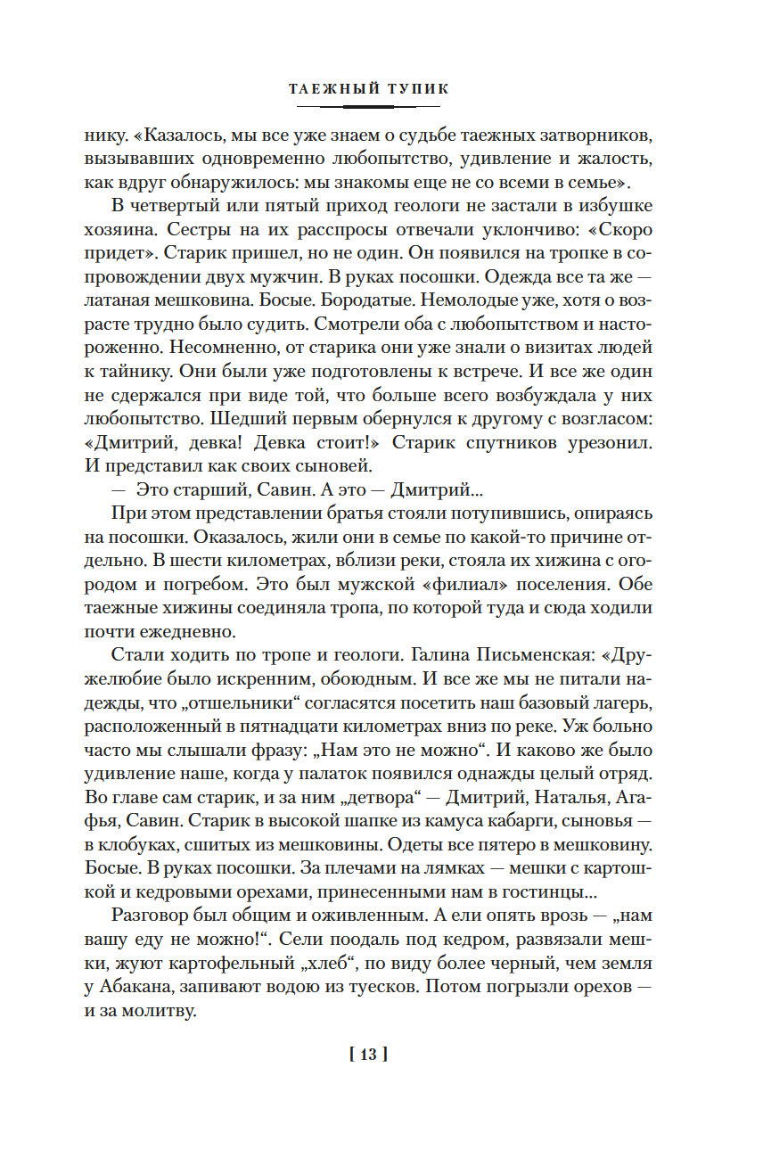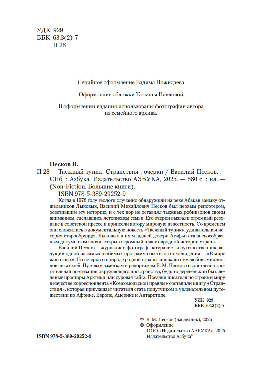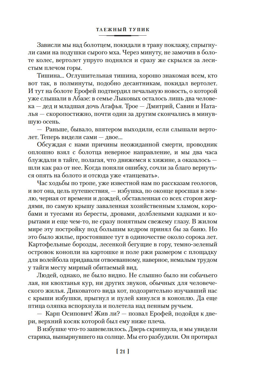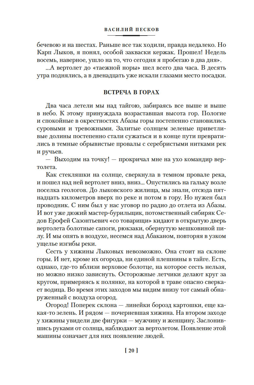 Когда в 1978 году геологи случайно обнаружили на реке Абакан заимку отшельников Лыковых, Василий Михайлович Песков был первым репортером, осветившим эту историю, и с тех пор не оставлял таежных робинзонов своим вниманием, сделавшись летописцем семьи. Его очерки вызвали огромный резонанс в советской прессе и принесли автору мировую известность. Со временем они сложились в документальную повесть "Таежный тупик", удивительная история старообрядцев Лыковых и их младшей дочери Агафьи стала своеобразным документом эпохи, открыв огромный пласт народной истории страны.