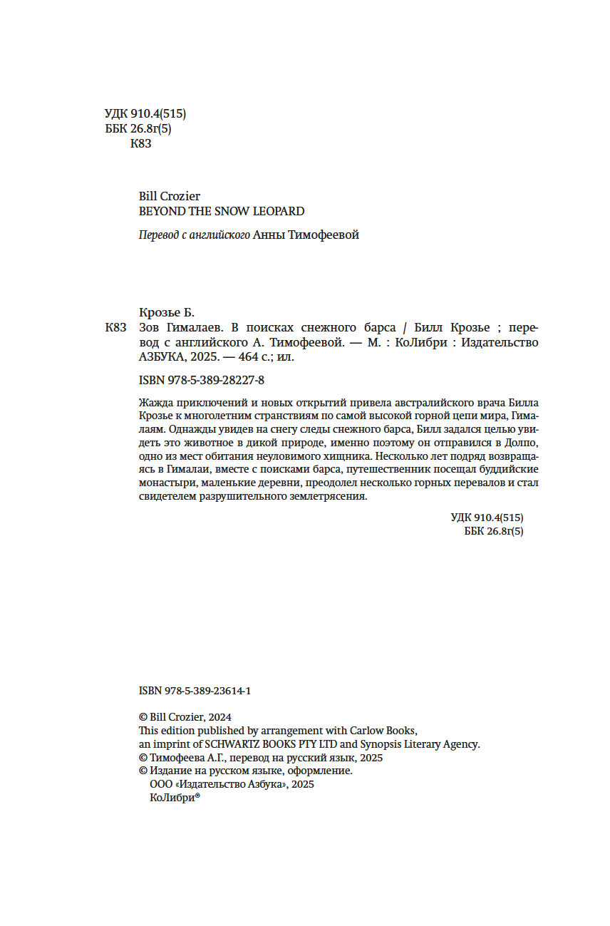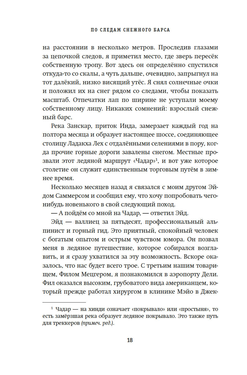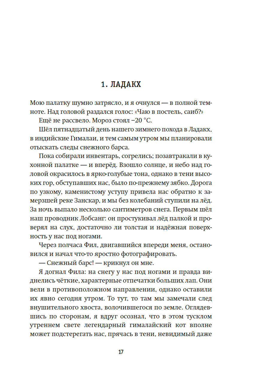 Жажда приключений и новых открытий привела австралийского врача Билла Крозье к многолетним странствиям по Гималаям. Однажды увидев на снегу следы снежного барса, Билл задался целью увидеть это животное в дикой природе, именно поэтому он отправился в Долпо, одно из мест обитания неуловимого хищника. Несколько лет подряд возвращаясь в Гималаи, вместе с поисками барса, путешественник посещал буддийские монастыри, маленькие деревни, преодолел несколько горных перевалов и стал свидетелем разрушительного землетрясения.