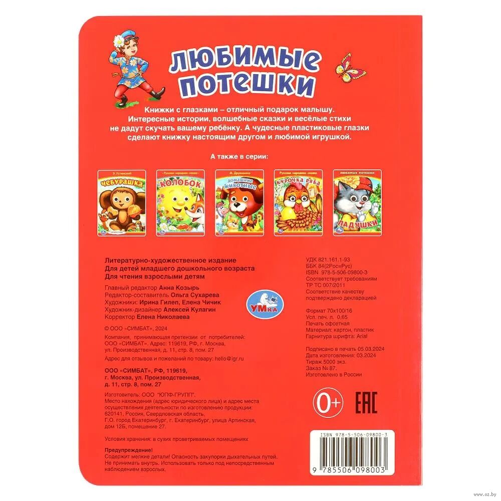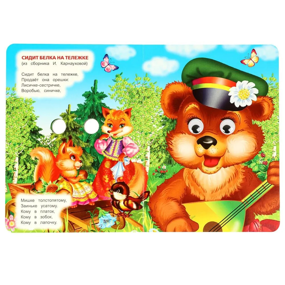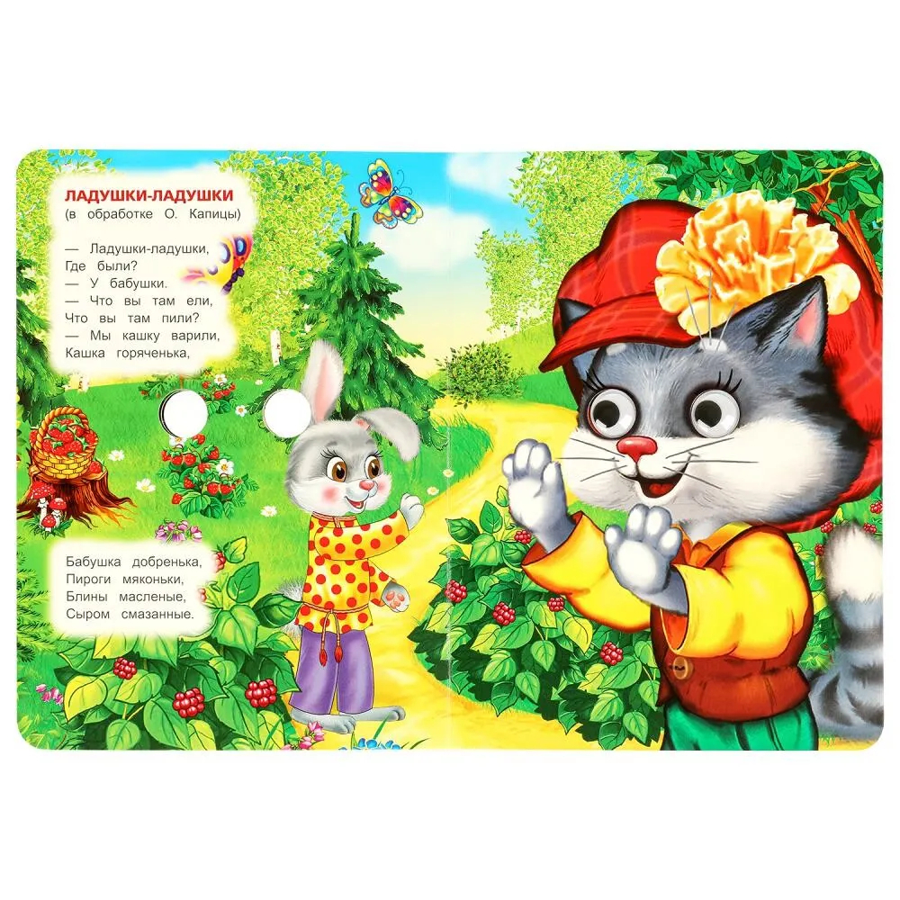 На страницах этой яркой книги ребенка ждет встреча с персонажами веселых потешек. Текст сопровождается большими красочными картинками с подвижными глазками, благодаря которым герои книги выглядят совсем как живые. Компактный размер издания позволяет взять его с собой в путешествие.