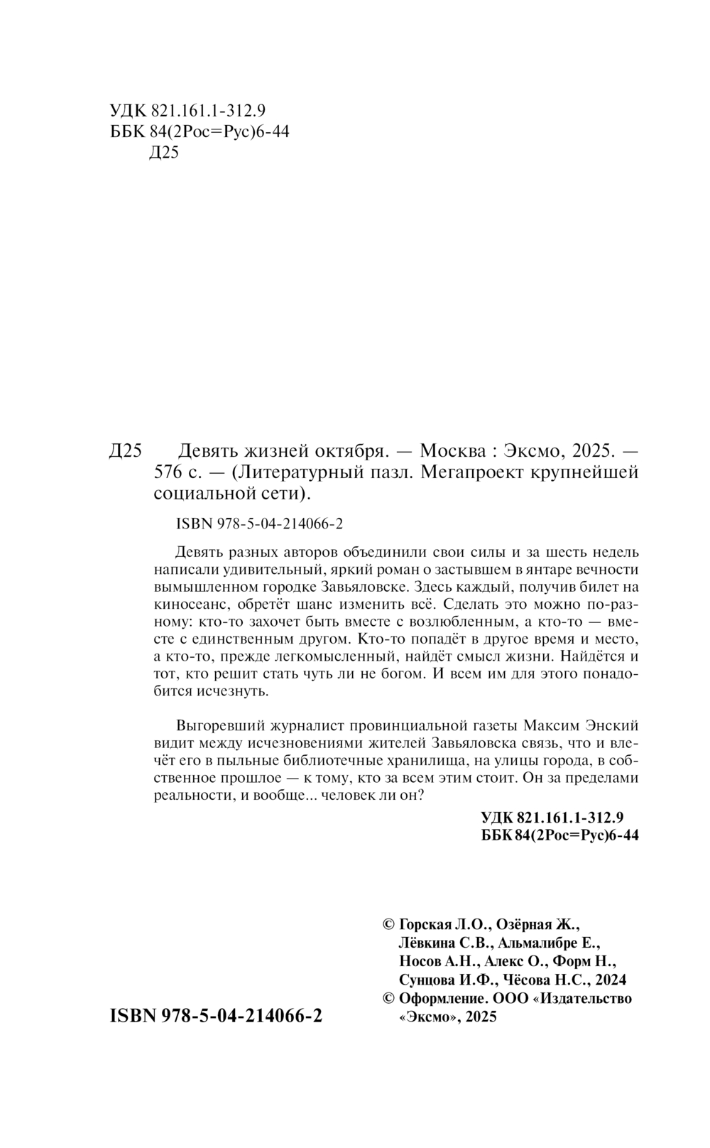 Девять разных авторов объединили свои силы и за шесть недель написали удивительный, яркий роман о застывшем в янтаре вечности вымышленном городке Завьяловске. Здесь каждый, получив билет на киносеанс, обретёт шанс изменить всё. Сделать это можно по-разному: кто-то захочет быть вместе с возлюбленным, а кто-то – вместе с единственным другом. Кто-то попадёт в другое время и место, а кто-то, прежде легкомысленный, найдёт смысл жизни. Найдётся и тот, кто решит стать чуть ли не богом. И всем им для этого понадобится исчезнуть.
