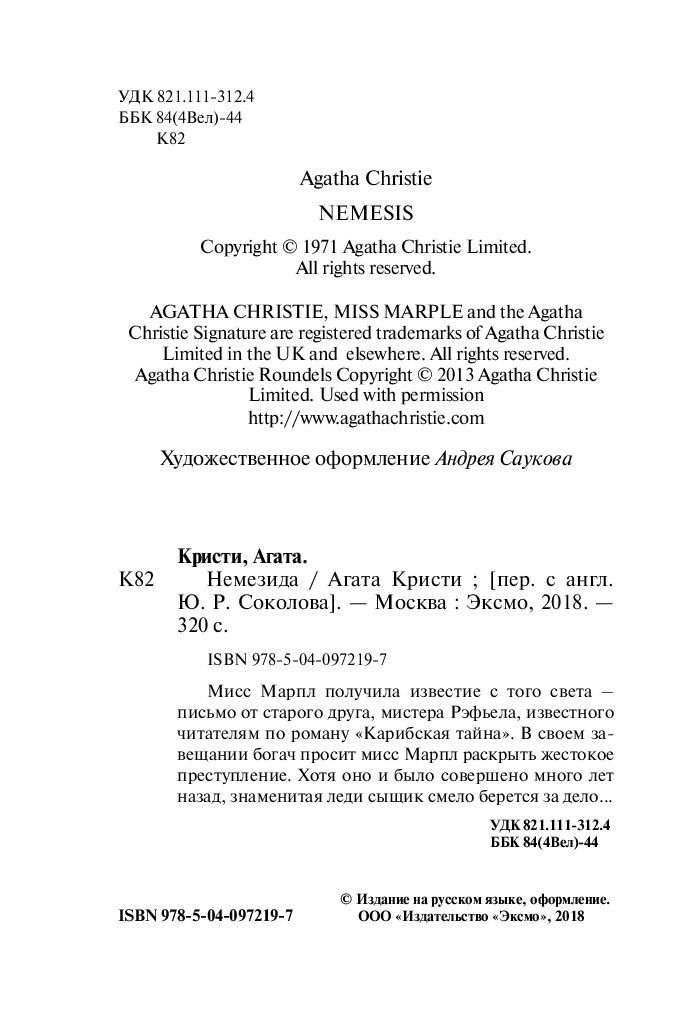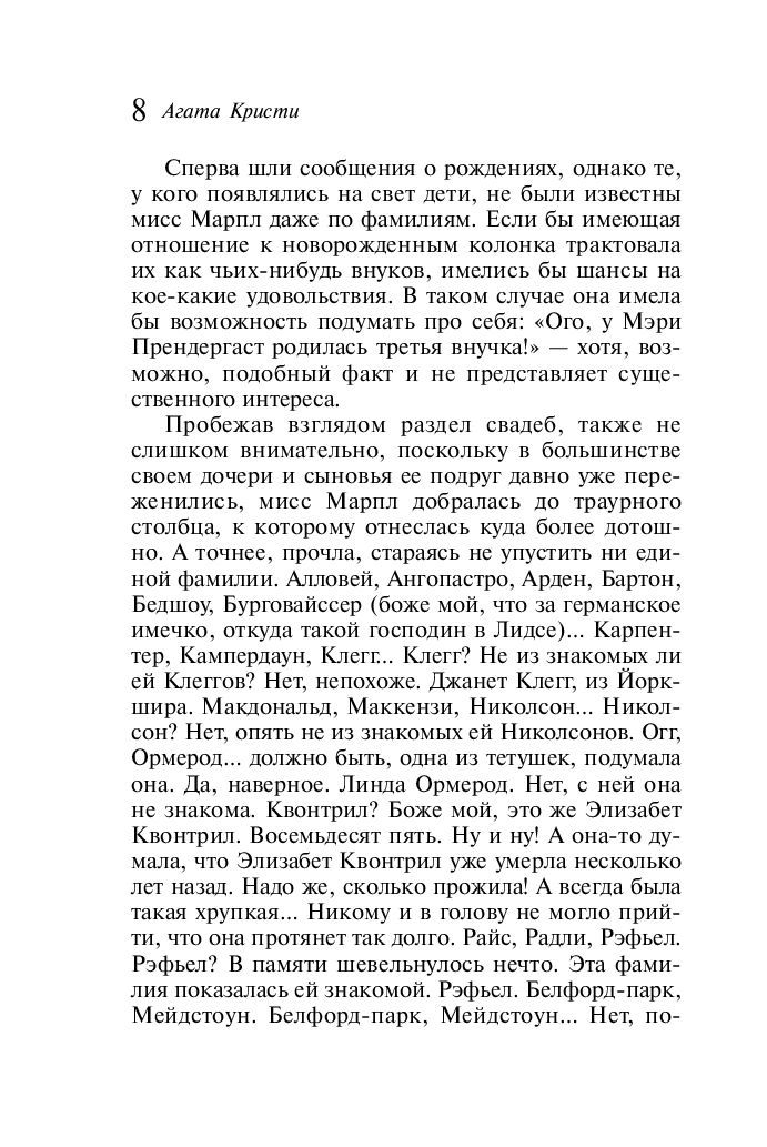 Мисс Марпл получила известие с того света – письмо от старого друга, мистера Рэфьела, известного читателям по роману "Карибская тайна". В своем завещании богач просит мисс Марпл раскрыть жестокое преступление. Хотя оно и было совершено много лет назад, знаменитая леди-сыщик смело берется за дело...