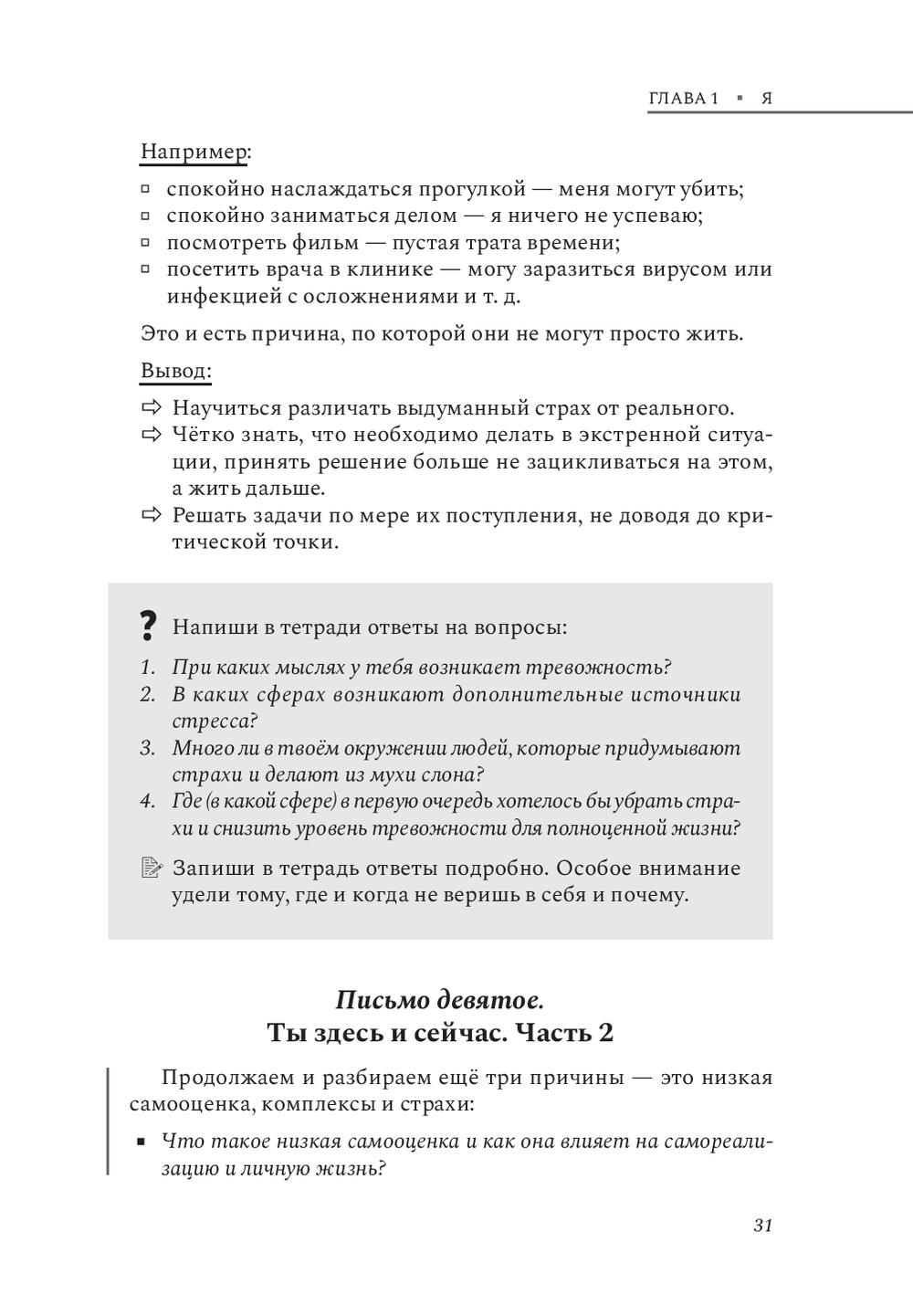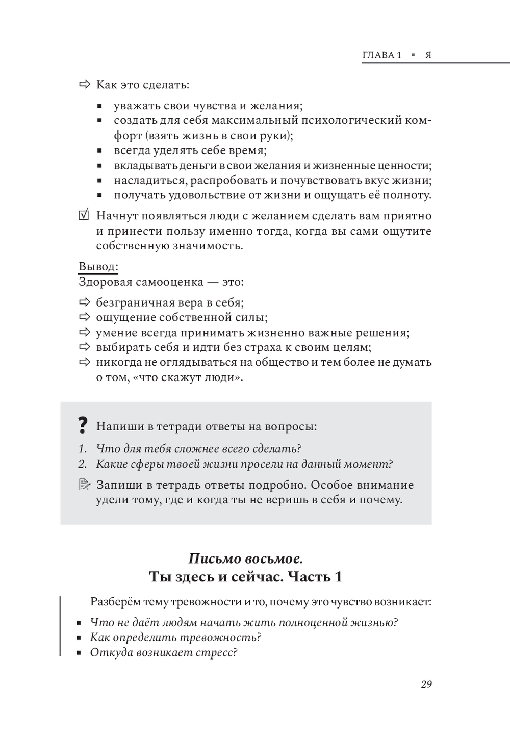 В разделах, посвящённых каждой сфере, я поделюсь опытом и знаниями, буду задавать тебе вопросы и попрошу ответить на них письменно. Постарайся писать максимально открыто и развернуто.