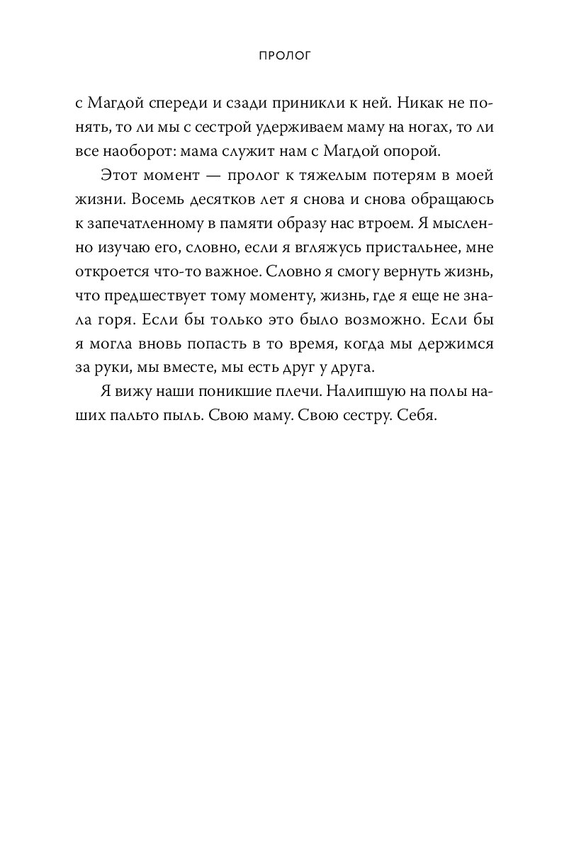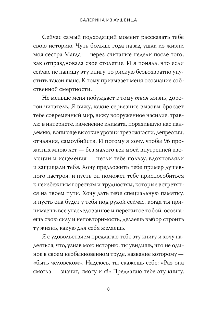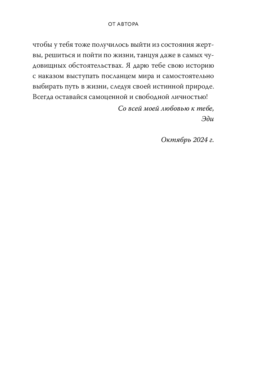 Это новая книга, созданная, чтобы вдохновлять, а не пугать. Эгер говорит голосом юной Эдит, влюбленной, мечтающей, ищущей себя. Откровенно и пронзительно, она заново по памяти воссоздает свое детство, первые чувства и чудо выживания в трагических условиях, делится собственными болью и надеждой. И вновь призывает: