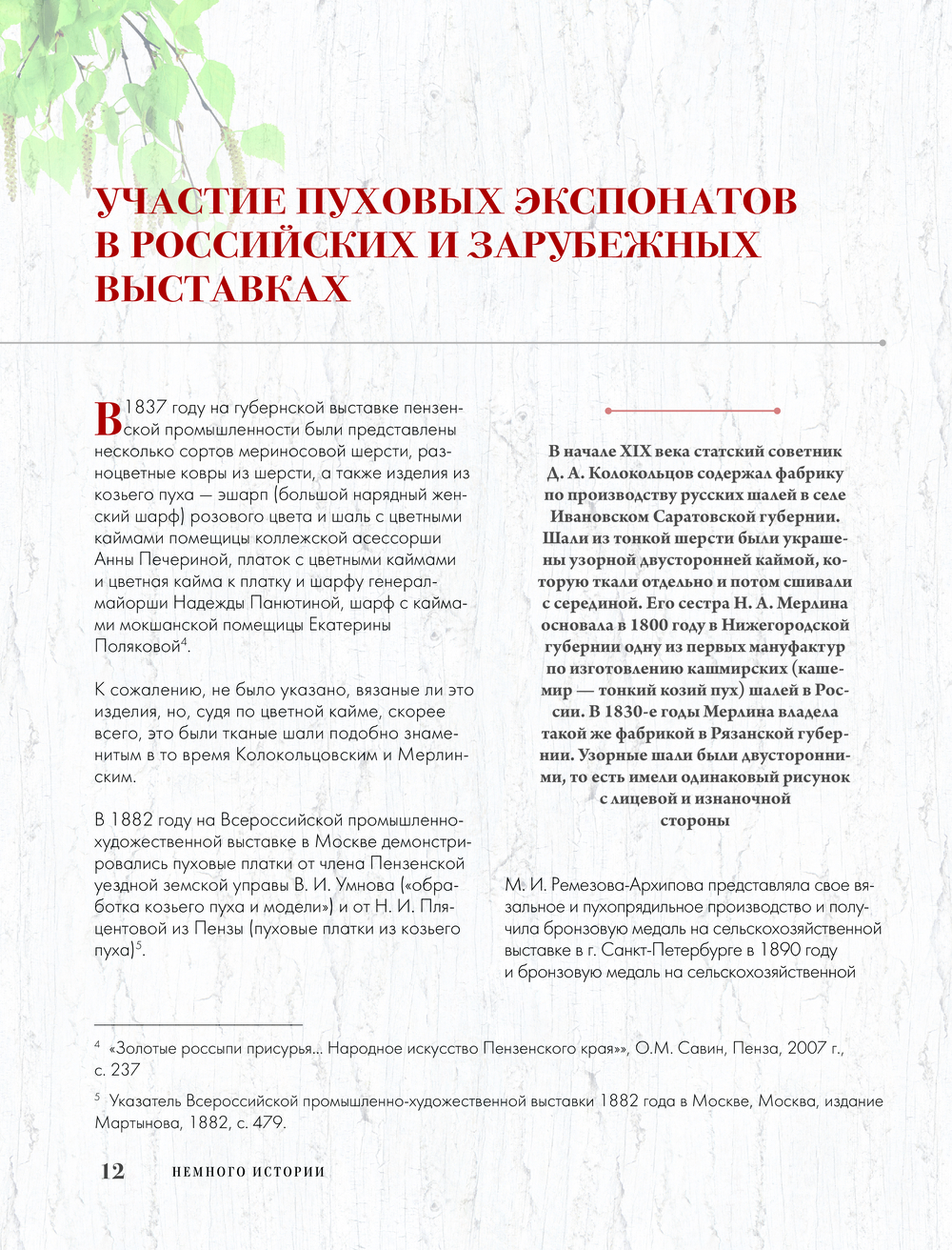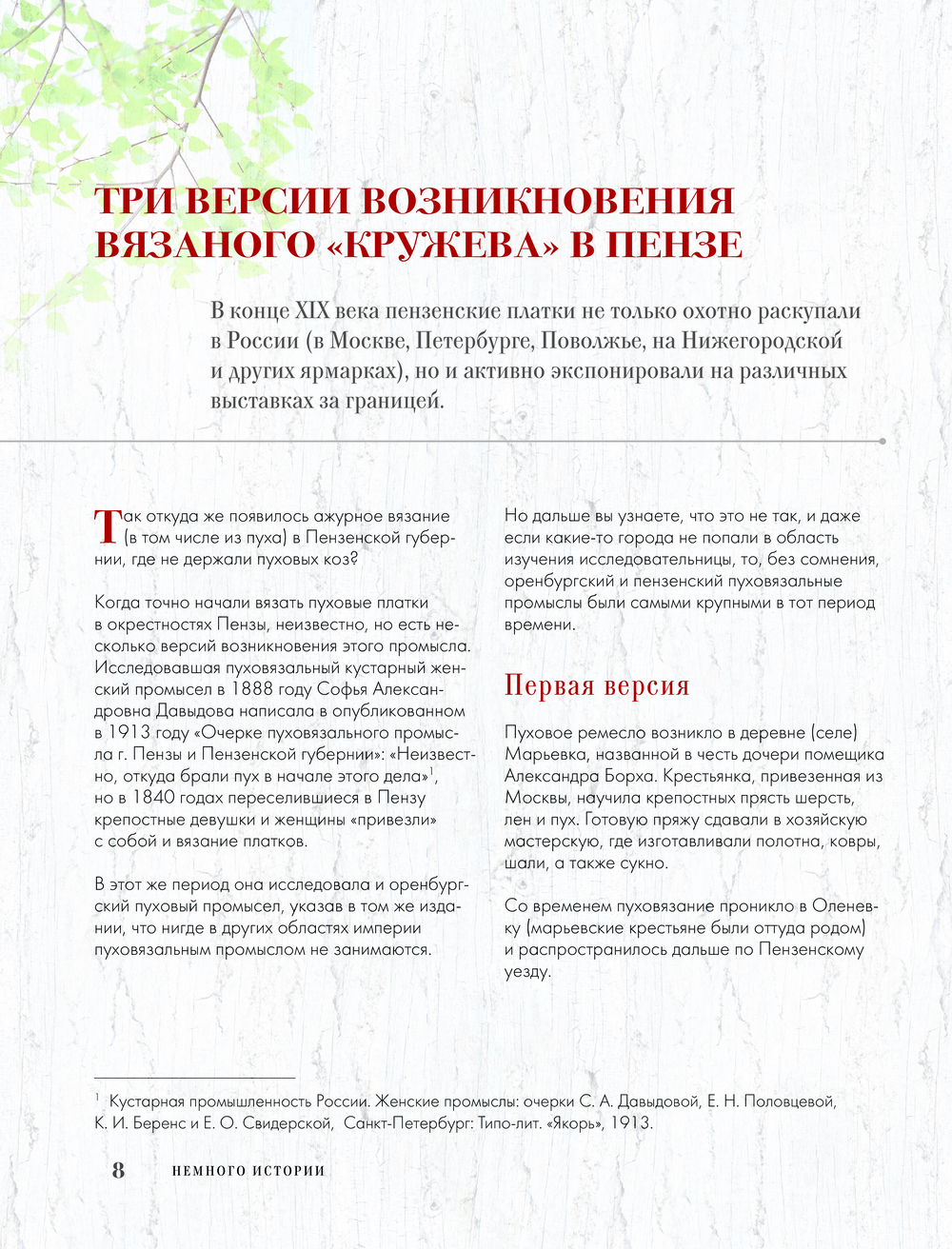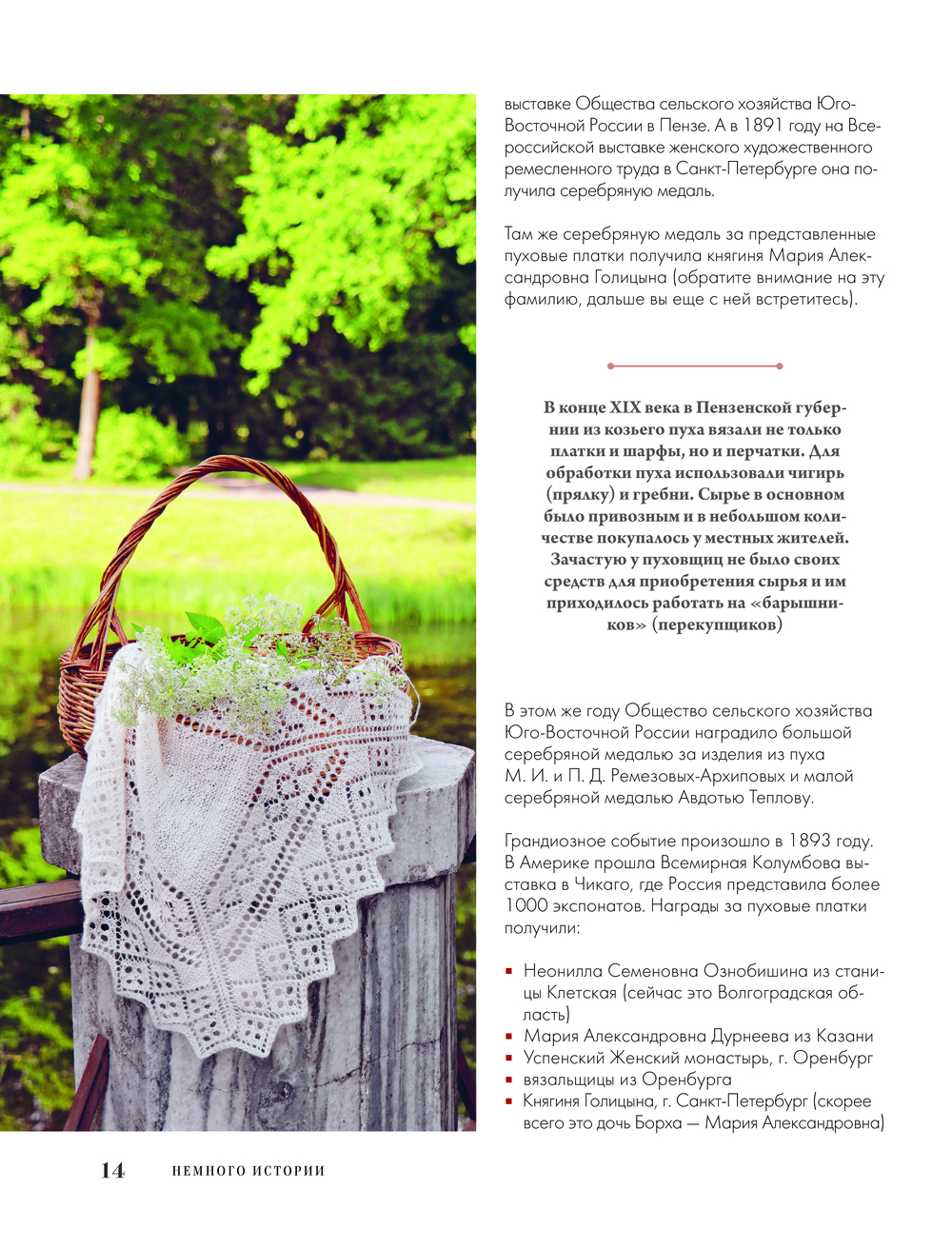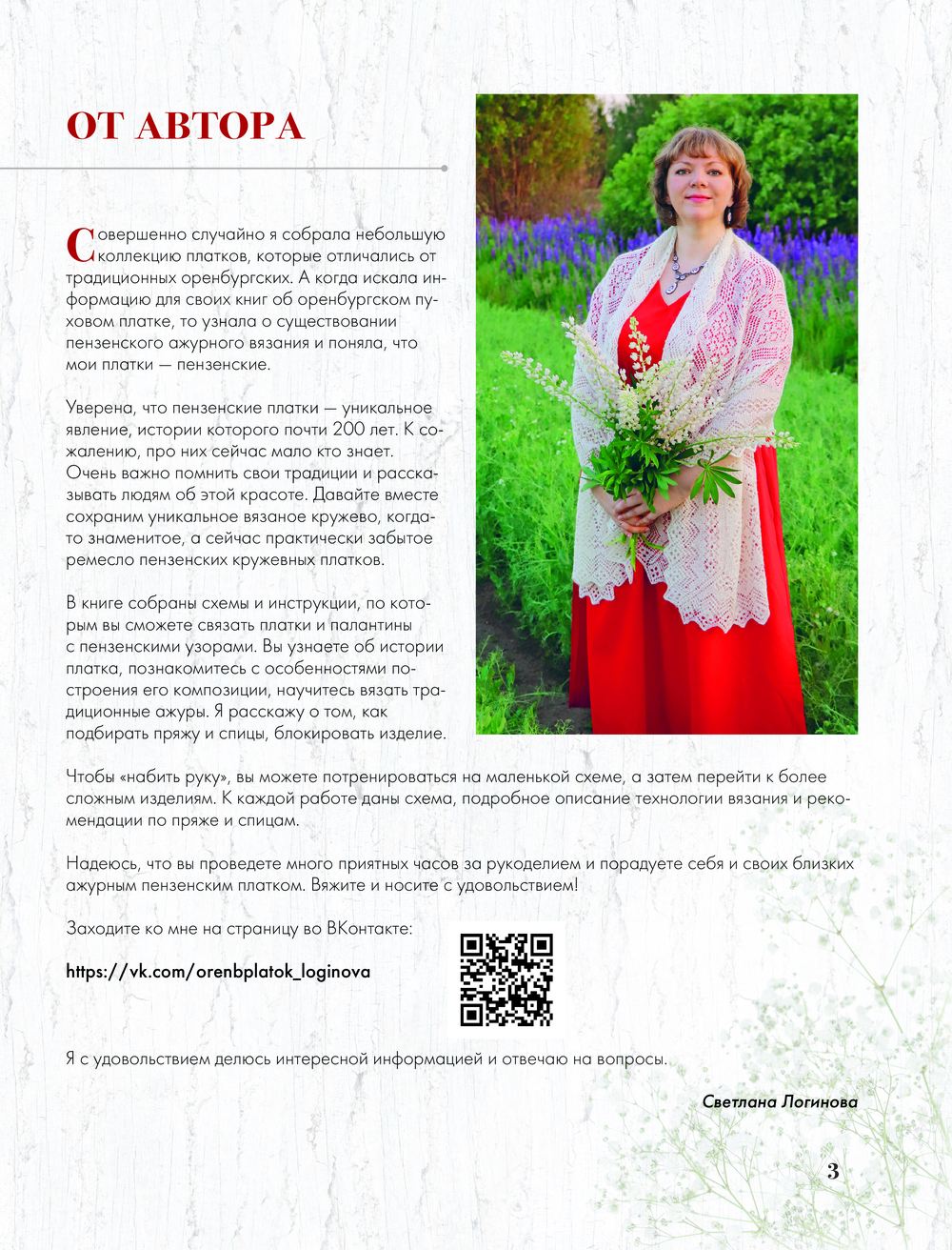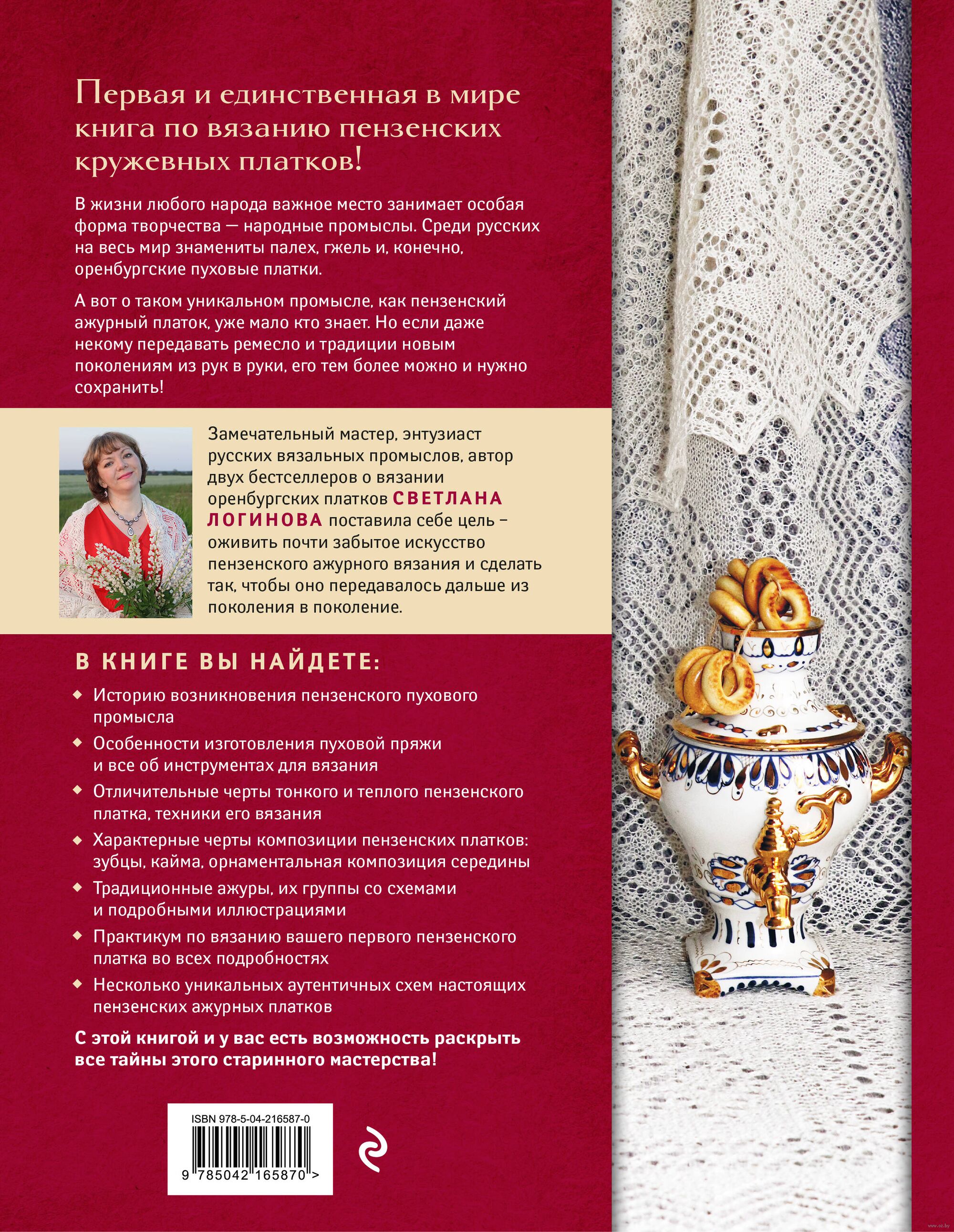 В книге вы найдете историю возникновения пензенского пухового промысла, особенности изготовления пуховой пряжи и все об инструментах для вязания, отличительные черты тонкого и теплого пензенского платка, техники их вязания, характерные черты композиции пензенских платков: зубцы, кайма, орнаментальная композиция середины, традиционные ажуры, их группы со схемами и подробными иллюстрациями, практикум по вязанию вашего первого Пензенского платка во всех подробностях! И конечно, свяжете несколько уникальных аутентичных схем настоящих пензенских кружевных платков.