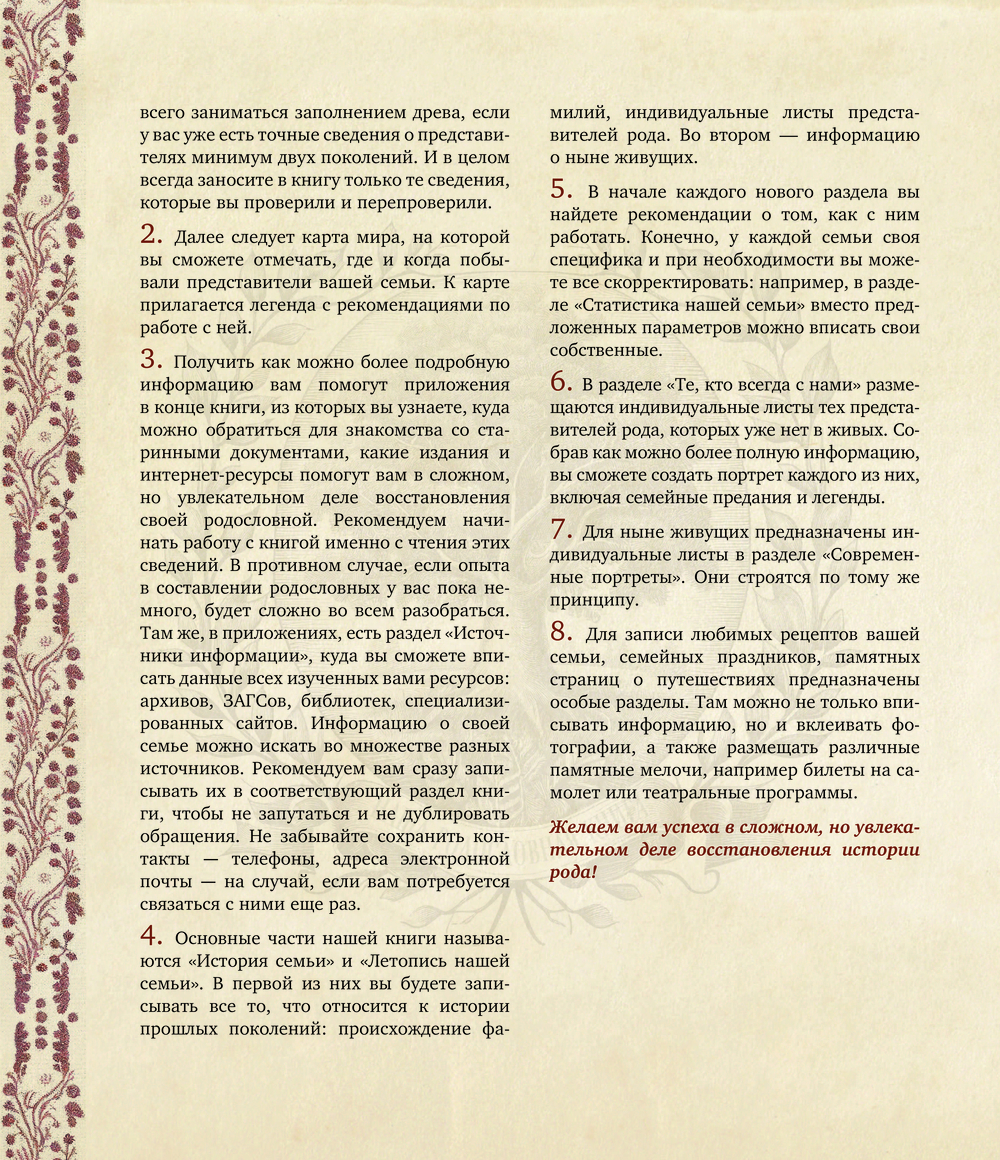 Уникальная родословная книга, которая не только поможет восстановить и бережно сохранить историю вашей семьи, но и создаст полный портрет ее нынешнего поколения, живущего в настоящем! Традиционное генеалогическое древо, география вашего рода, история фамилий, памятные даты и события – для всего найдется место на ее красивых страницах. А еще свой след оставят ваши родные и близкие, по крупицам восстанавливая и фиксируя каждую черточку, присущую вашей семье! Фамильные рецепты и поговорки, портреты любимых питомцев, самые яркие путешествия, совместные праздники – обо всем этом узнают ваши внуки и правнуки, листая эту роскошную книгу. Гаджеты устареют, а память о вас останется!