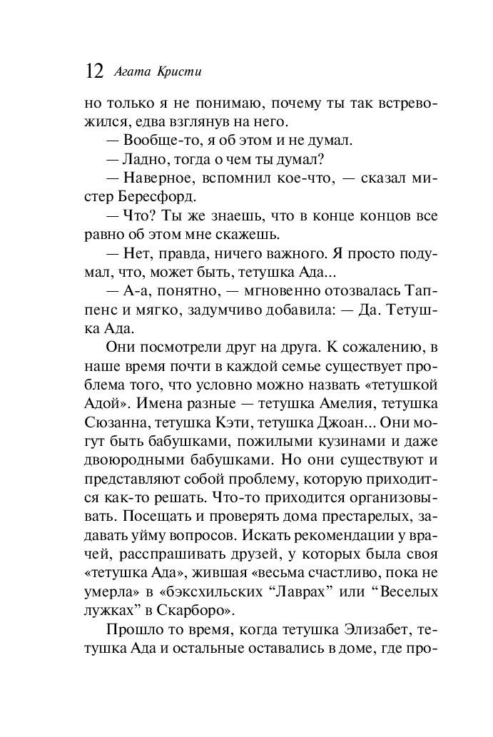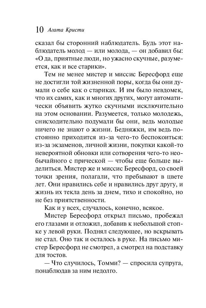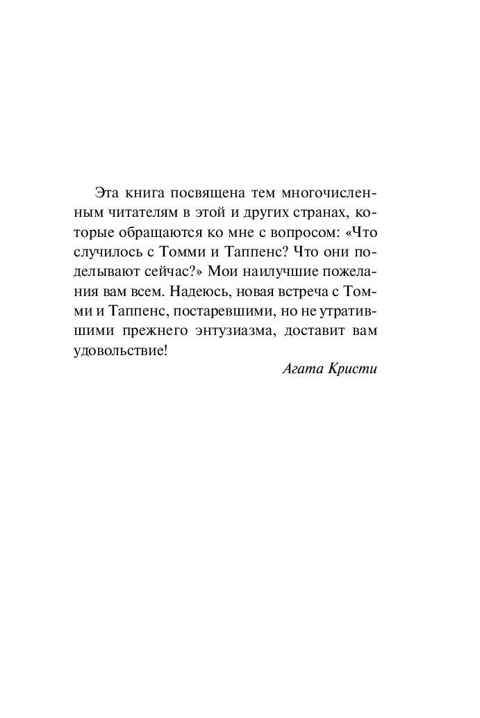 Почтенная чета Бересфордов – некогда неуемные искатели приключений Томми и Таппенс – посещает родственницу в доме престарелых. Там Таппенс случайно знакомится с одной странной старушкой, которая рассказывала всем подряд о зловещих убийствах, отравлениях и черной магии. А вскоре Бересфорды узнают о том, что эта старушка внезапно – и совершенно бесследно – исчезла из богоугодного заведения. И неугомонная Таппенс отправляется на ее поиски, несмотря на свой уже солидный возраст, – ибо чутье подсказывает ей, что дело тут и впрямь нечисто...