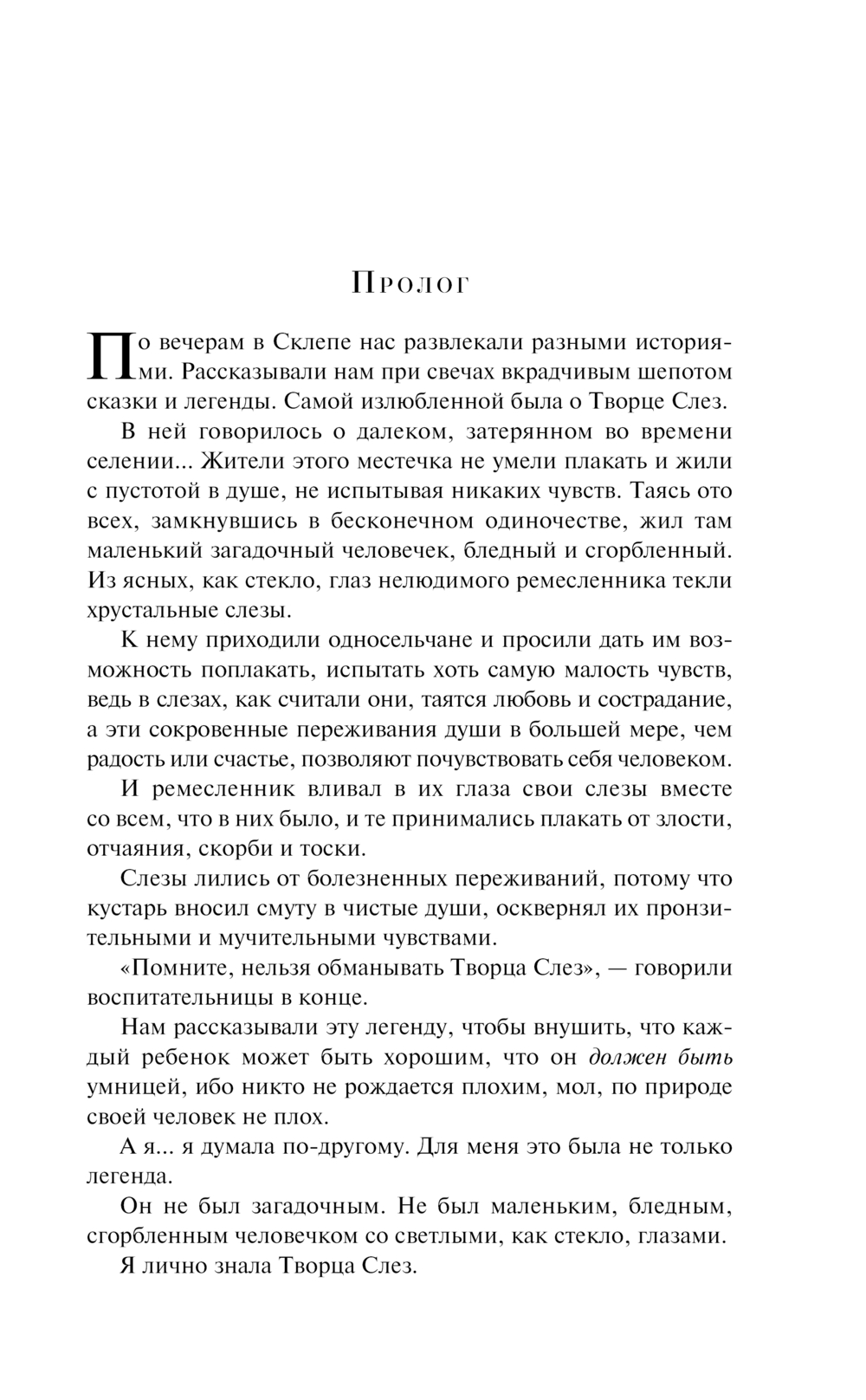 В сиротском приюте, где росла Ника, часто рассказывали истории. Самой излюбленной была о Творце слез, человеке со светлыми, как стекло, глазами. Он выполнял просьбы людей и заставлял их плакать.