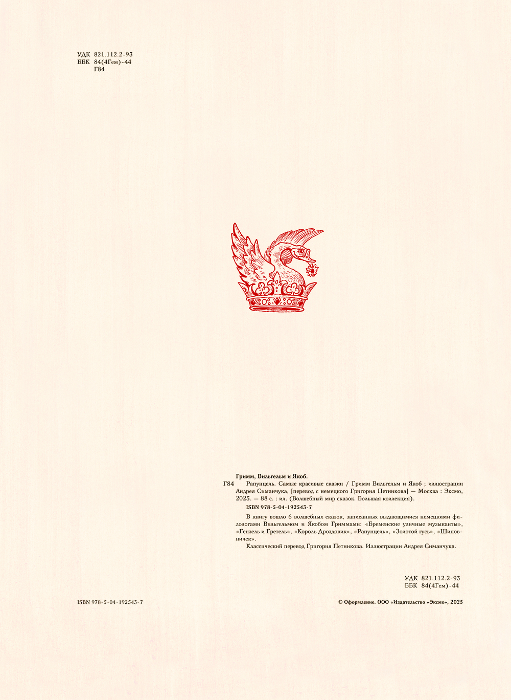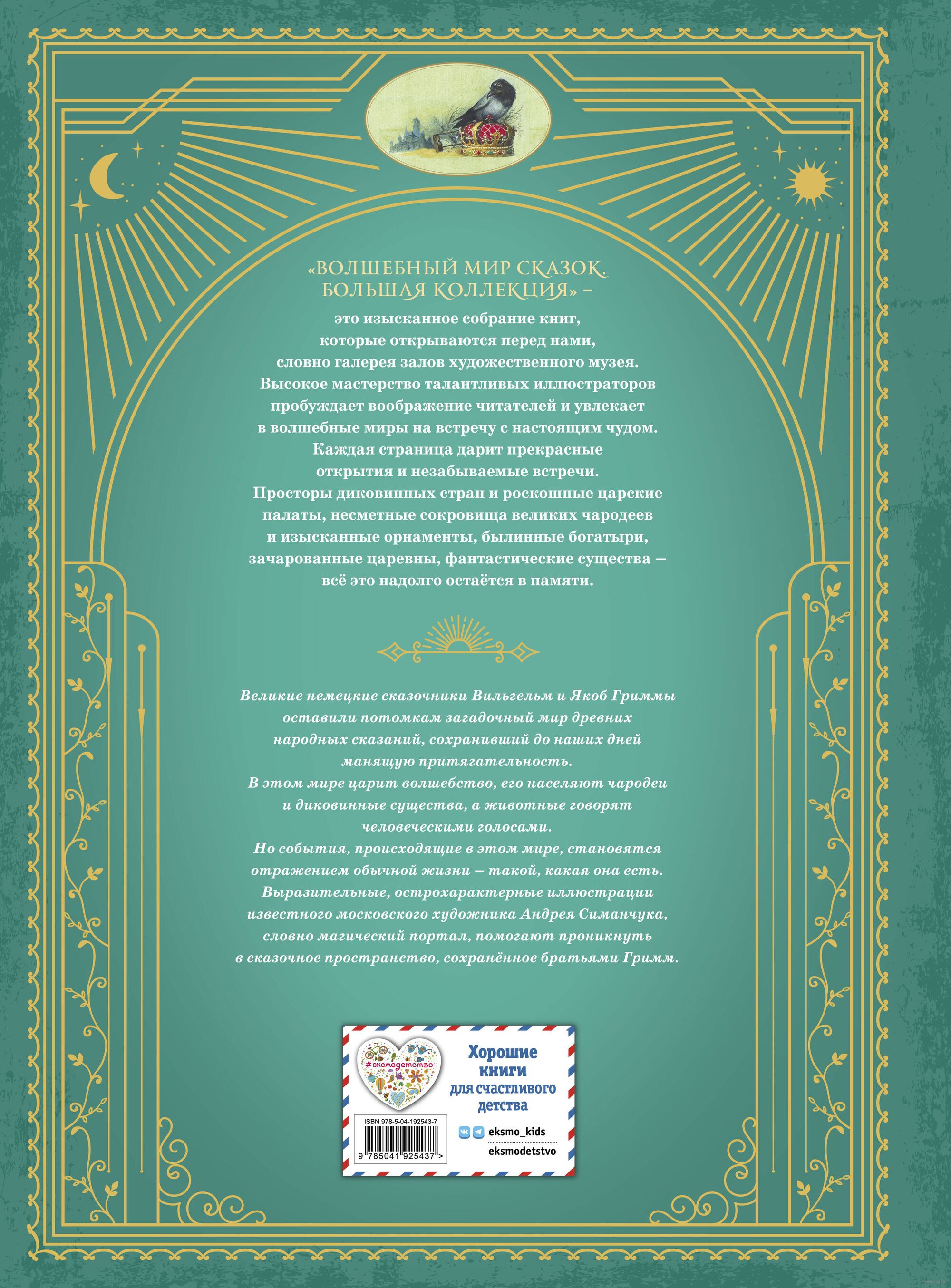 Шесть прекрасных сказок из коллекции великих немецких филологов Якоба и Вильгельма Гриммов известны всему миру. "Бременские уличные музыканты", "Гензель и Гретель", "Король Дроздовик", "Рапунцель", "Золотой гусь", "Шиповничек" многократно экранизированы, а их сюжеты ложились в основы спектаклей, мюзиклов, песен и даже компьютерных игр. Насыщенные, стильные иллюстрации в духе немецкого романтизма Андрея Симанчука и классический перевод Григория Петникова сделают эту книгу прекрасным подарком к любому празднику.