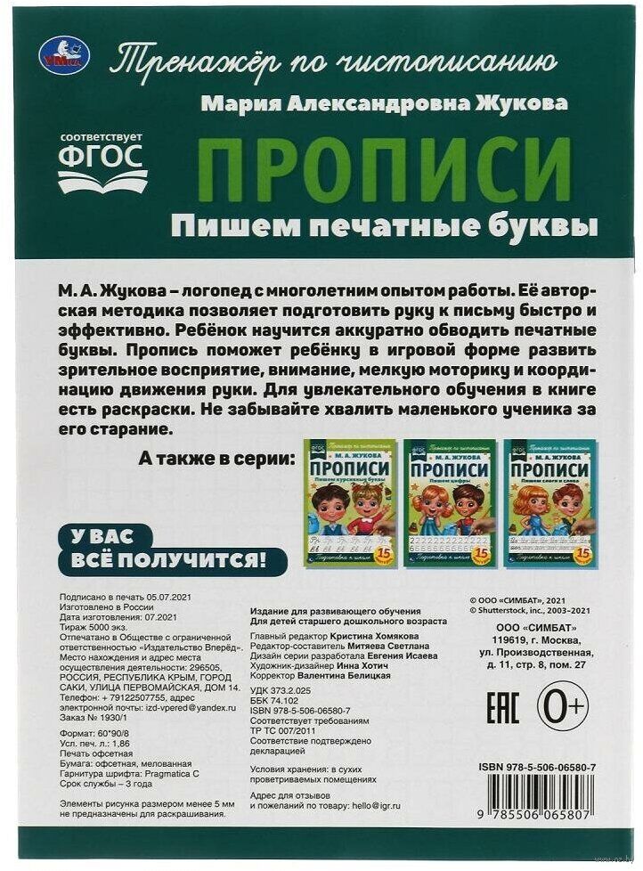 Данные прописи разработаны Марией Александровной Жуковой педагогом-логопедом с многолетним опытом работы в дошкольных учреждениях. На страницах этой тетради ребёнка ожидают занимательные упражнения по написанию печатных букв. Кроме того, издание содержит разнообразные картинки с чётким контуром, которые малыш с удовольствием будет раскрашивать. Для достижения эффективных результатов в чистописании достаточно заниматься с детьми по 15 минут в день главное, поддерживать их интерес и хвалить за успехи.