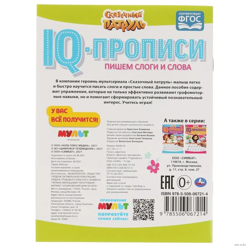 Ребенок будет рад повстречаться на страницах этой занимательной книжки с героями популярного мультсериала. В компании юных волшебниц из Сказочного патруля девочка с удовольствием будет тренироваться в написании слогов и целых слов, а также раскрашивать красивые картинки с четким контуром. Для достижения эффективных результатов в чистописании достаточно заниматься с детьми по 15 минут в день – главное, поддерживать их интерес и хвалить за успехи.