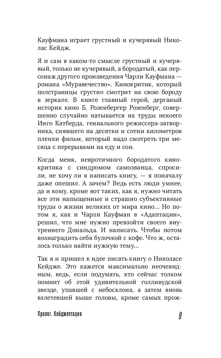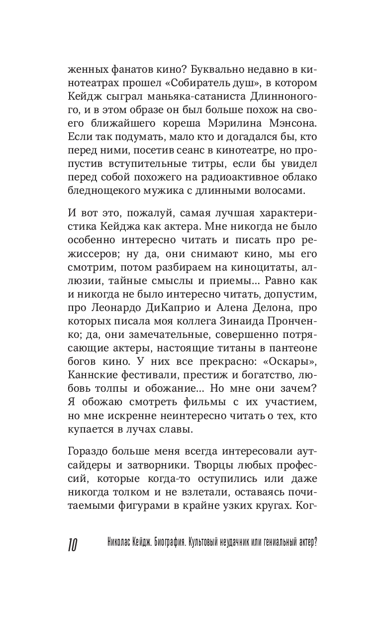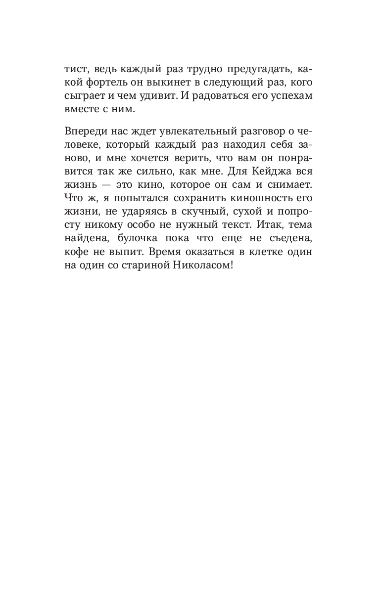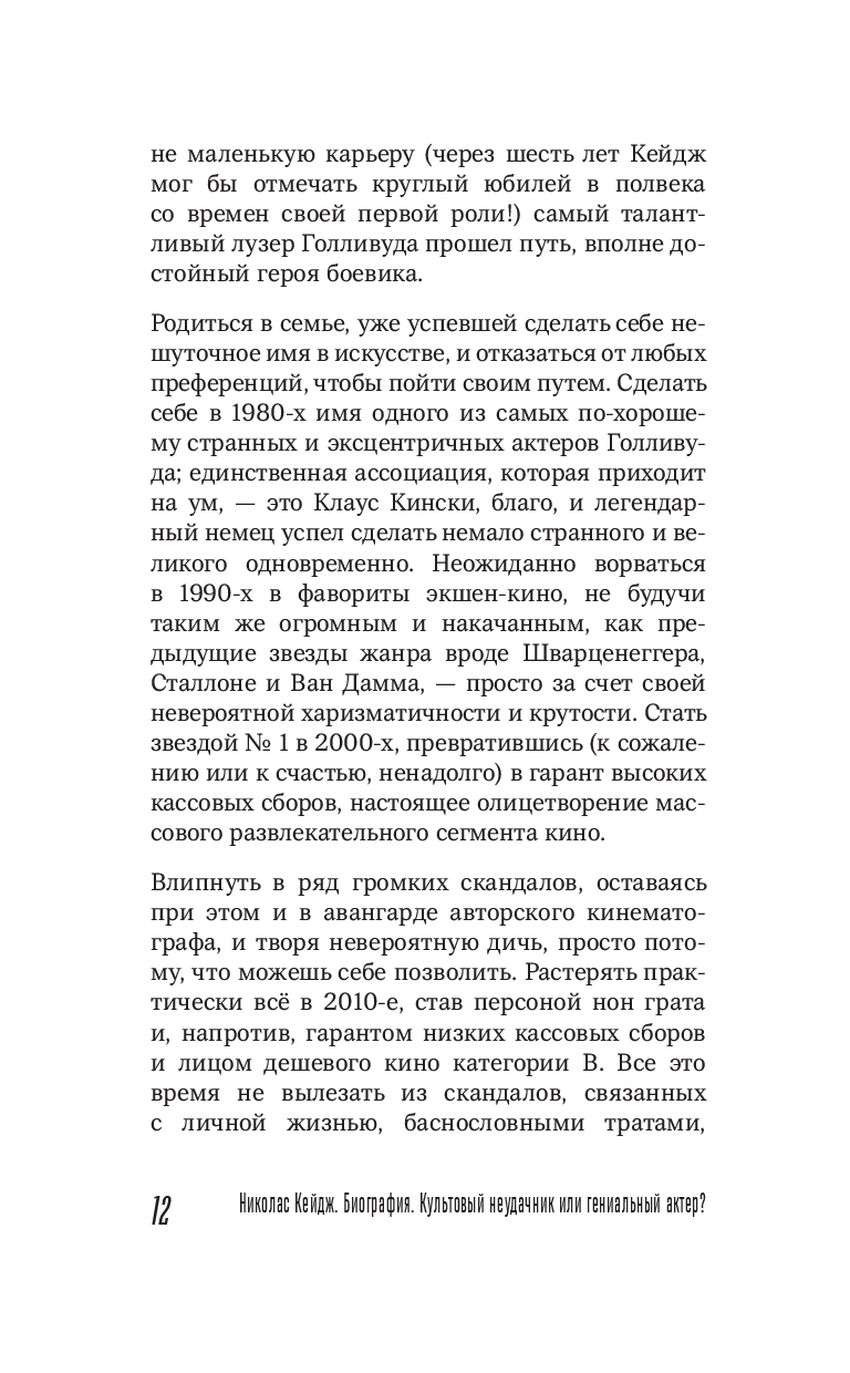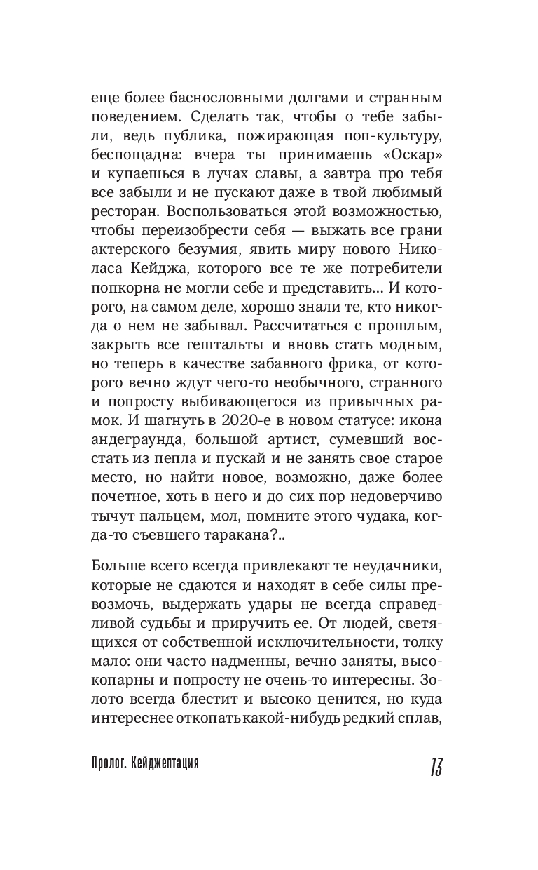 Книга кинокритика Ивана Афанасьева поможет понять, почему игра Кейджа одновременно восхищает и смущает, почему он то появляется в блокбастерах, то снимается в безумных низкобюджетных фильмах, и как ему удаётся оставаться одним из самых узнаваемых актёров мира.