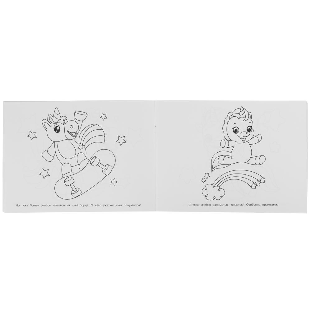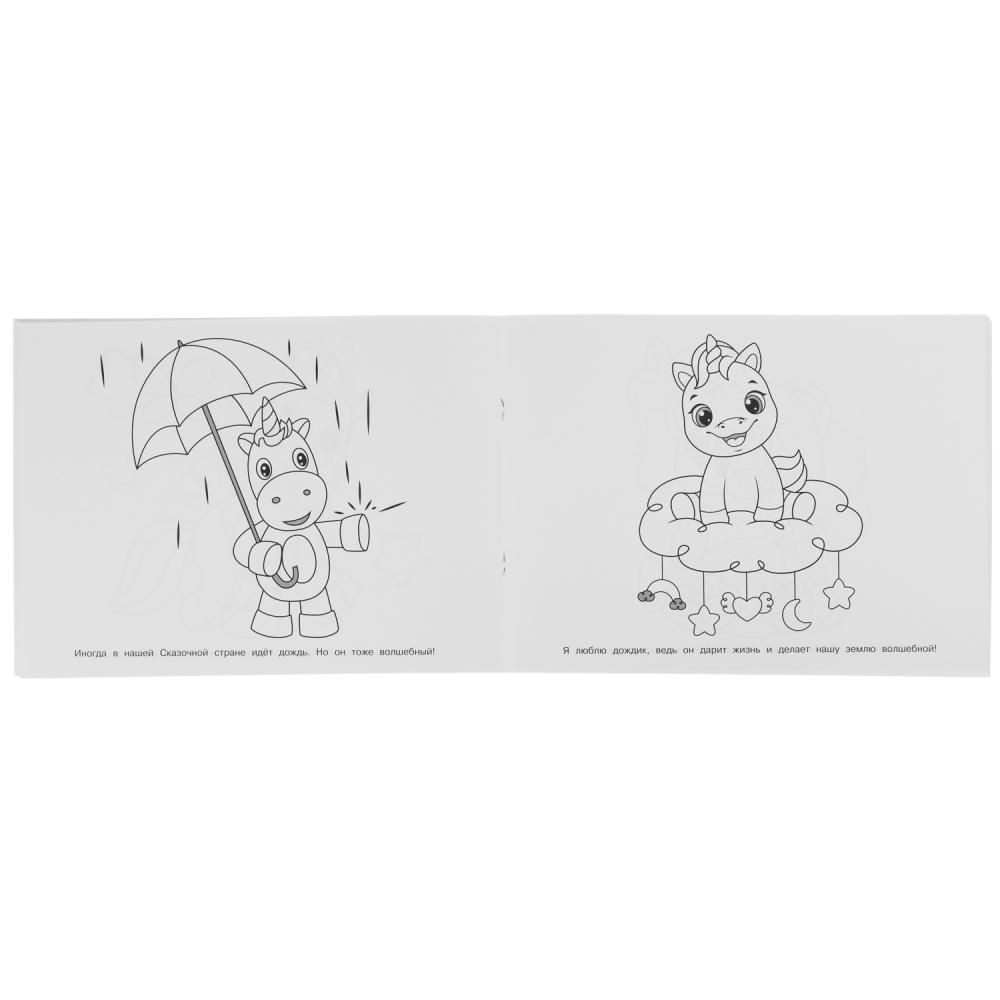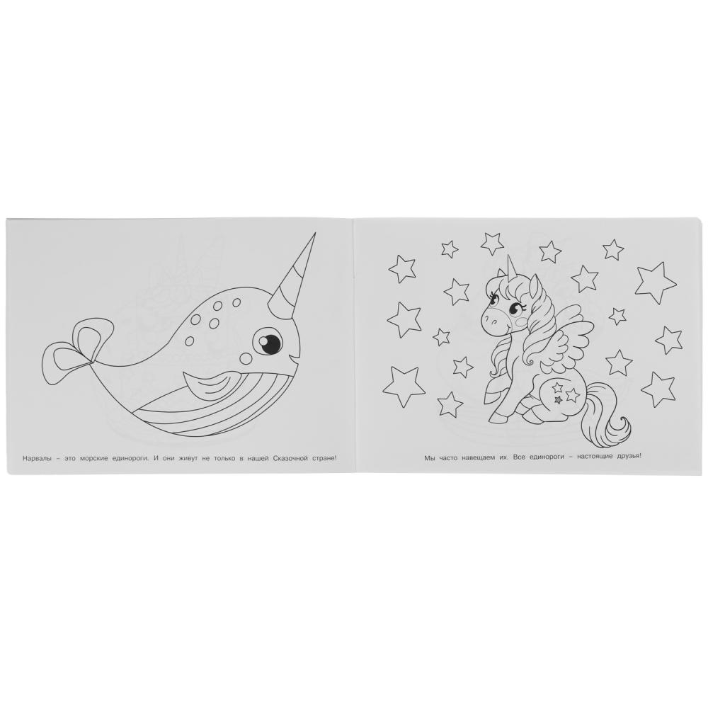 Ребёнок будет рад повстречаться на страницах этой занимательной раскраски с весёлыми единорогами и их сказочными друзьями. В ней он найдёт интересные картинки с чёткими контурами и подписи к ним. Альбомный формат и крупные изображения отлично подойдут даже для малышей, они научатся правильно держать карандаш и разовьют моторику рук.