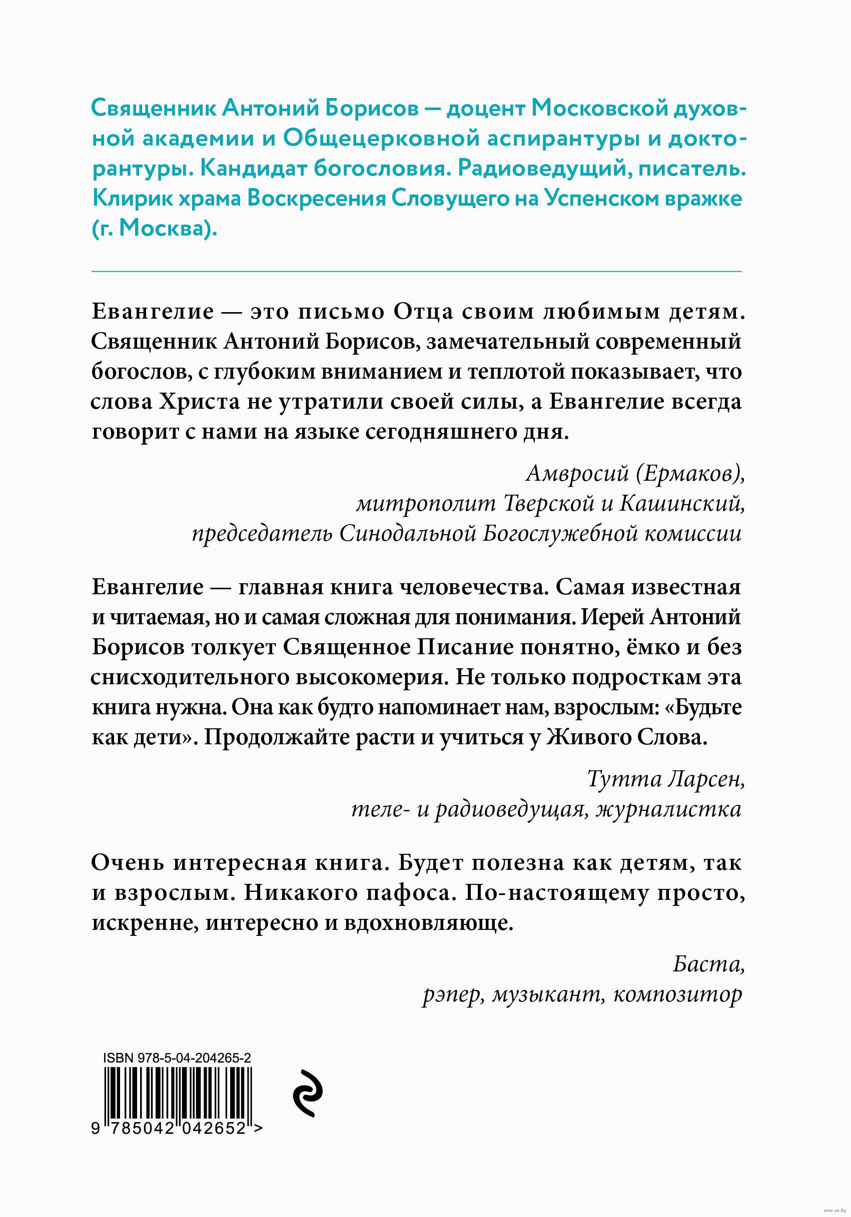 Православный священник Антоний Борисов, замечательный современный богослов, с глубоким вниманием и теплотой показывает, что слова Христа не устарели и не утратили своей силы. Автор помогает Евангелию стать ещё более доступным и для взрослых, и для молодых людей, и даже для маленьких детей. Рекомендовано для чтения в Воскресной школе, к семейному и индивидуальному прочтению.