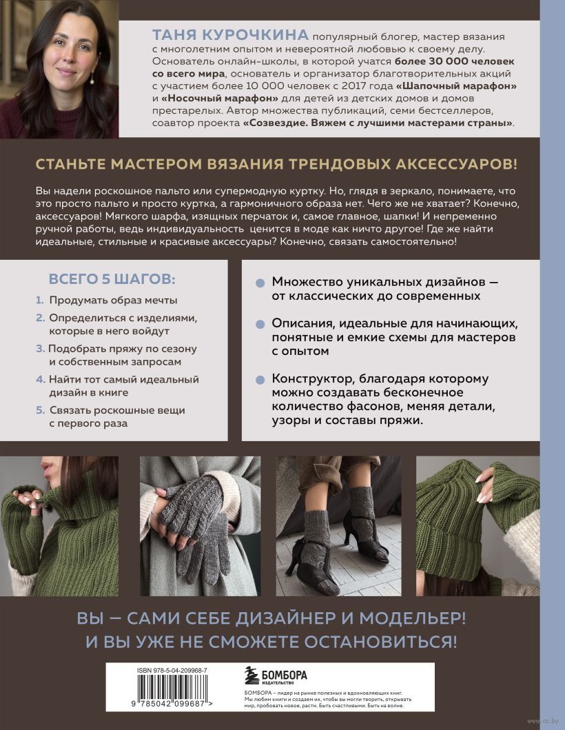 5 шагов к созданию аксессуаров вашей мечты: продумать будущий образ, определиться с изделиями, которые в него войдут, подобрать пряжу по сезону и собственным запросам, найти в книге тот самый, идеальный, ваш дизайн!
