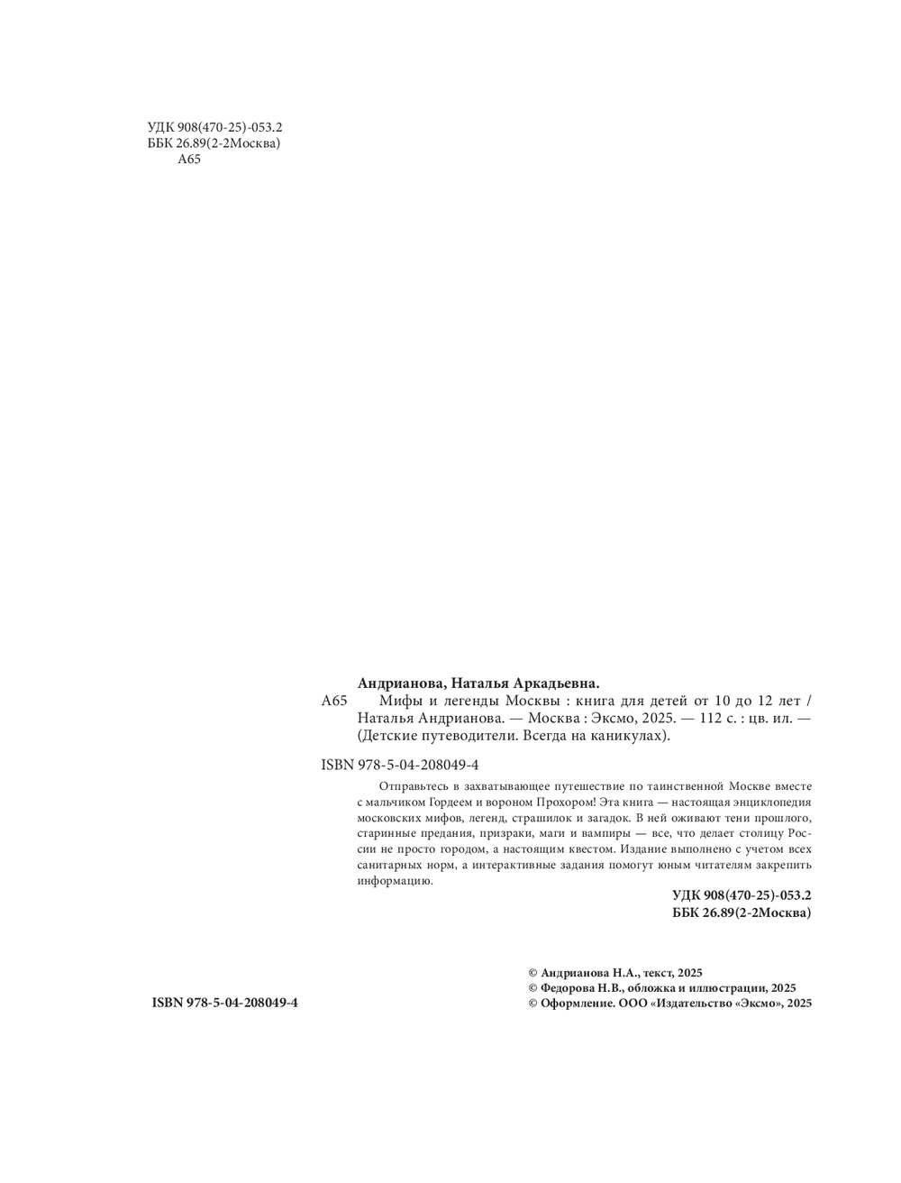 Отправьтесь в захватывающее путешествие по таинственной Москве вместе с мальчиком Гордеем и вороном Прохором! Эта книга – настоящая энциклопедия московских мифов, легенд, страшилок и загадок. В ней оживают тени прошлого, старинные предания, призраки, маги и вампиры – все, что делает столицу России не просто городом, а настоящим квестом. Издание выполнено с учетом всех санитарных норм, а интерактивные задания помогут юным читателям закрепить информацию.