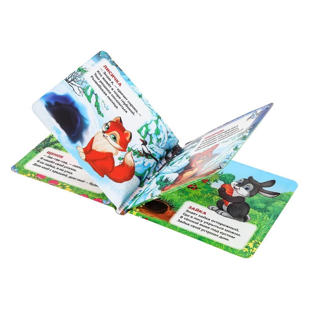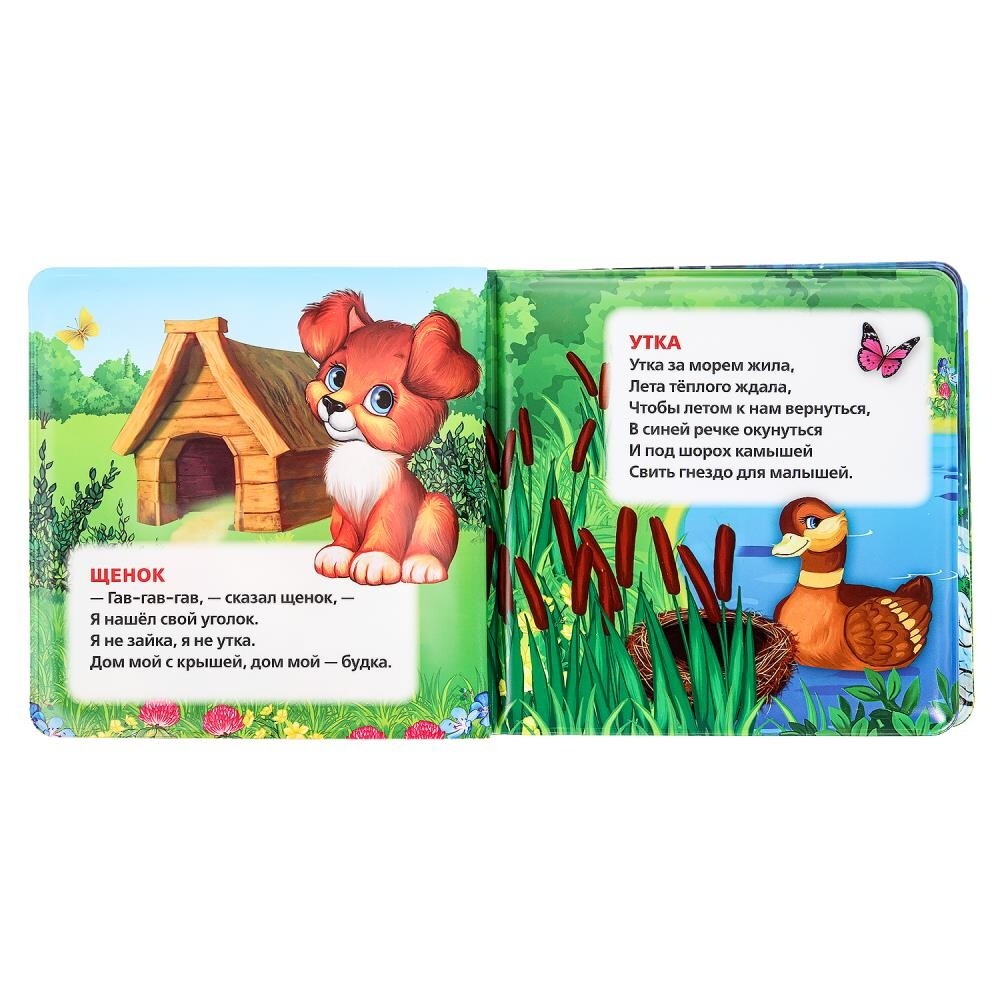 Книга с красочными изображениями милых животных и интересными стихами про них обязательно заинтересует малыша. Кроме того, она сможет развеселить маленького непоседу тем, что при нажатии на страницу издаёт забавный пищащий звук. С такой игрушкой ребёнку будет весело и интересно принимать ванну, а также её можно использовать во время кормления или прогулок: непромокаемый материал легко моется.