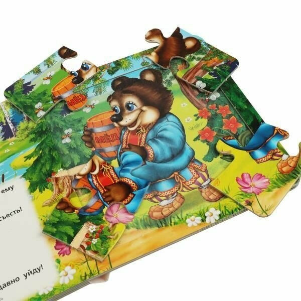 Открыв книжку-игрушку, вы обнаружите на каждом развороте по 6 деталей пазлов. Когда все элементы собраны вместе, они превращаются в захватывающие картинки из русско-народной сказки. Всего их пять.