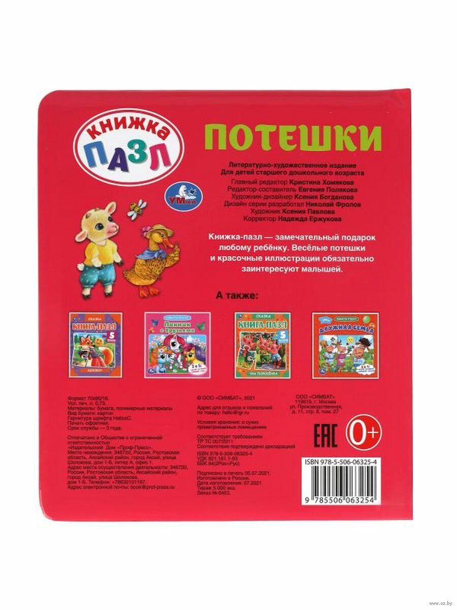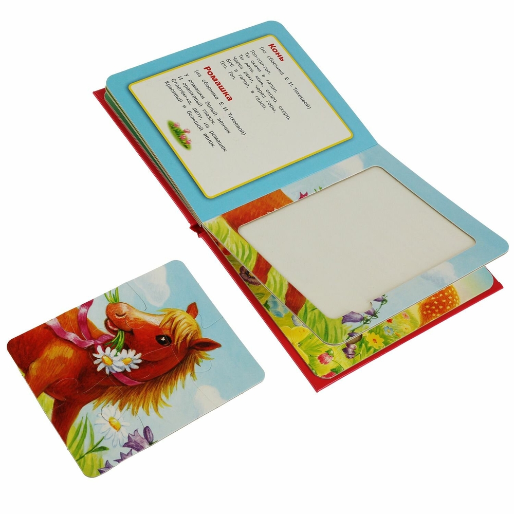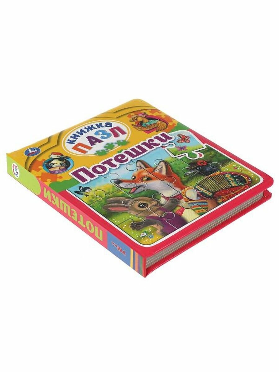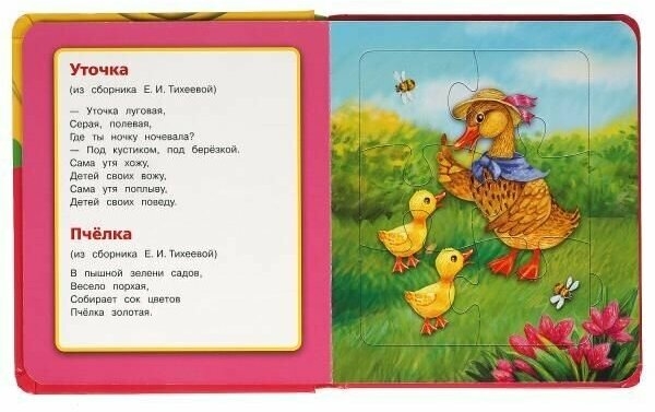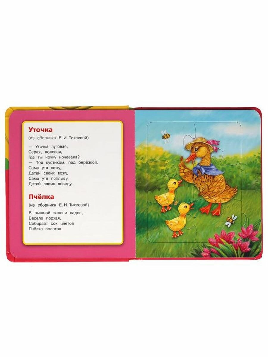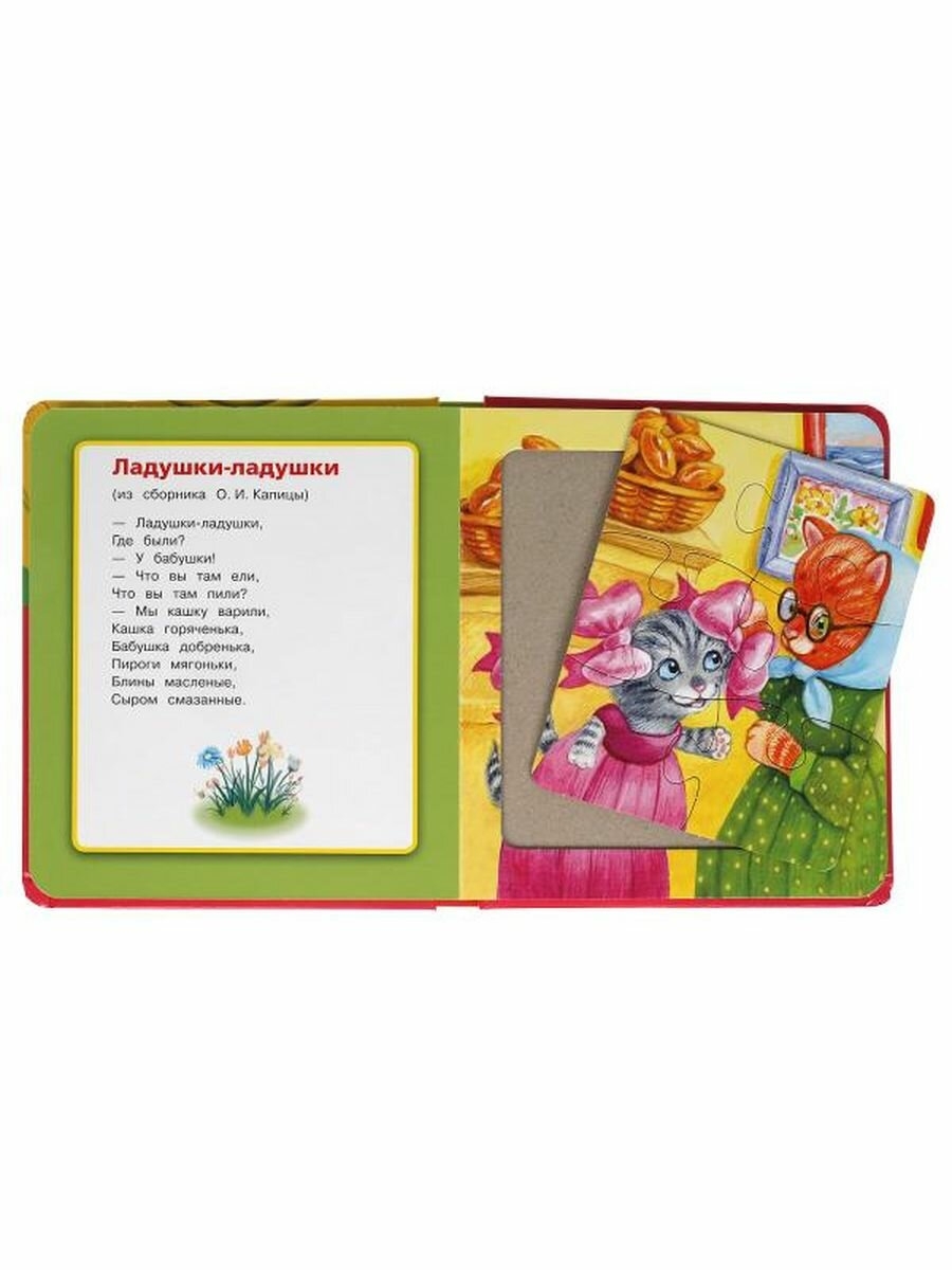 Данная книга выполняет сразу 2 функции: это и книга для чтения, и игра в пазлы. На каждом развороте малыша ждут задорные потешки, а также яркий пазл с изображением их героев. Книжка изготовлена из плотного картона, поэтому мамы могут не опасаться, что ребёнок порвёт странички. Благодаря компактным размером книгу удобно брать с собой.