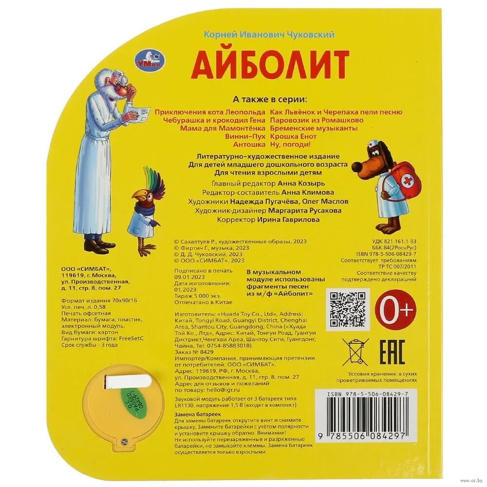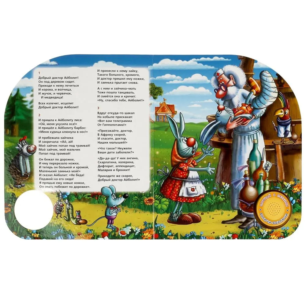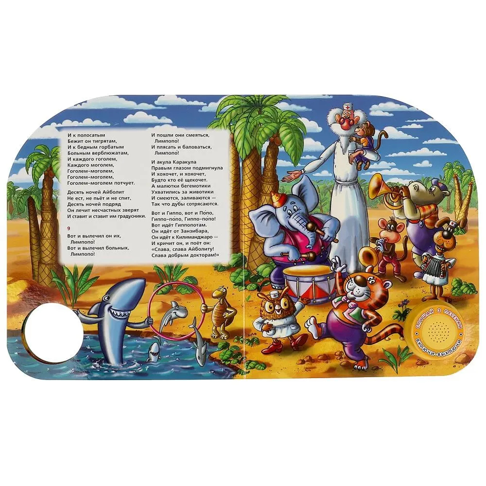 Ребенок с удовольствием будет листать плотные страницы, рассматривать красочные картинки, вместе с родителями читать известную стихотворную сказку Корнея Чуковского и, конечно, нажимать на кнопку и слушать веселые песенки. Малыш легко освоит включение звука: по нажатию на кнопку песенка включится, при втором нажатии выключится, при третьем – заиграет следующая композиция. Благодаря компактному размеру книгу удобно взять с собой в дорогу.