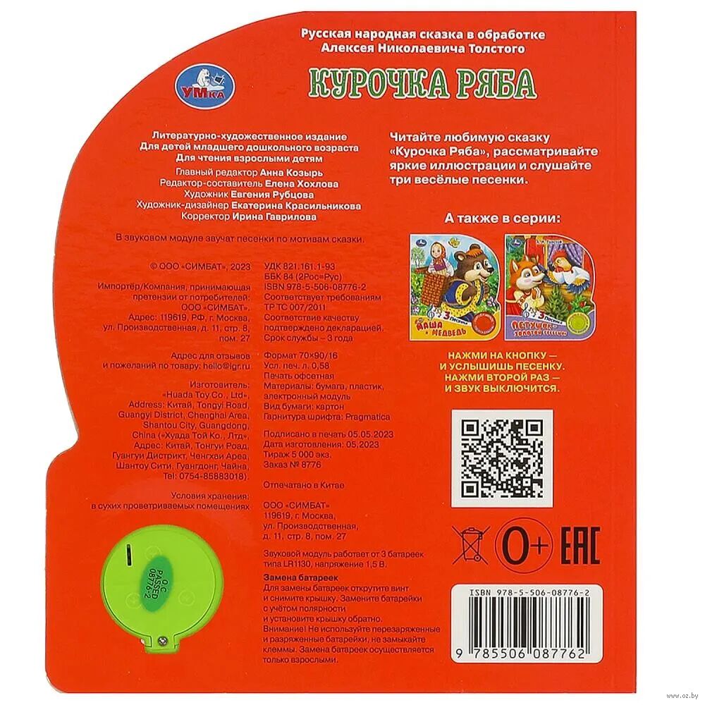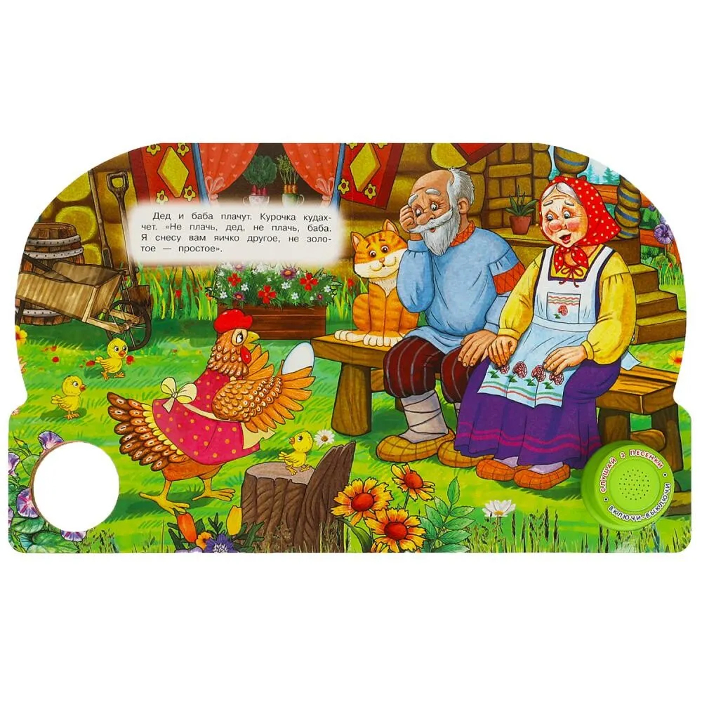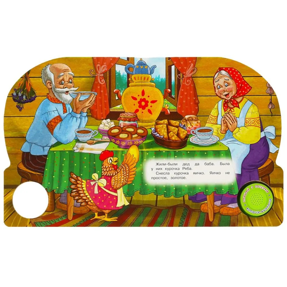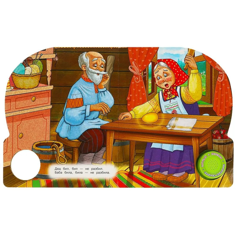 Ребенок с удовольствием будет листать плотные страницы, рассматривать красочные картинки, вместе с родителями читать известную русскую народную сказку и, конечно, нажимать на кнопку и слушать мелодичные песенки. Малыш легко освоит включение звука: по нажатию на кнопку песенка включится, при втором нажатии выключится, при третьем – заиграет следующая композиция. Благодаря компактному размеру книгу удобно взять с собой в дорогу.